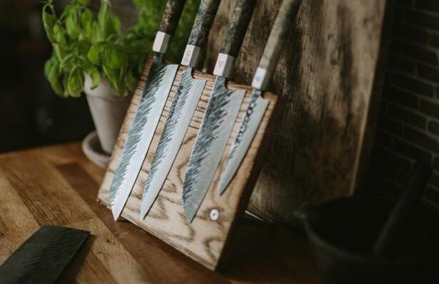 Handbankat blad av 5 lager AUS10-stål Blad med vackert ”Rain Pattern” som gör att råvaror inte sugs fast på bladsidan när du skär