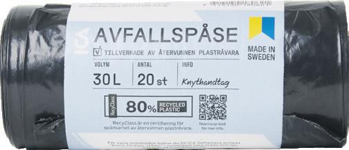 ICA. 20-pack. Avfallspåse med knythandtag. Tillverkad av minst 80% återvunnen råvara. Storlek: 50x60cm. Jfr pris 0:75/st.