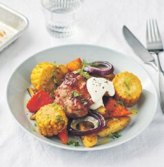 Allt på en plåt med majs, paprika och kycklinglårfilé