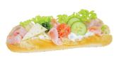 Baguette, räksallad, majonnäs, ägg, räkor, rödlök, pepparrot, sallad, gurka, tomat, citron, persilja, lime.