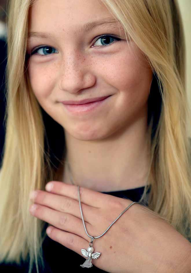 Alva har ett hängsmycke med en ängel om halsen.