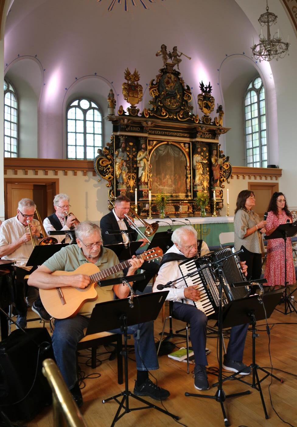 – Från början var vi bara tre personer i husbandet, minns Johannes. Men Owe Åsberg från Hunnebo, med sin bakgrund och kontakter i frikyrkan, lockade snart in flera andra. Och vår egen kantor Andreas Boström servar bandet med noter och arrangemang och deltar på pianot.