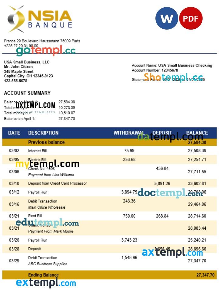 Completely editable bank company account statement template – to fill out your detailed information and business finances easily.