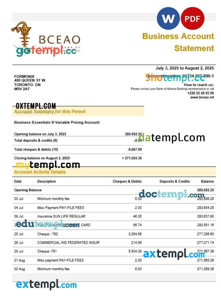 The Central Bank of West African States organization checking account statement Word and PDF format