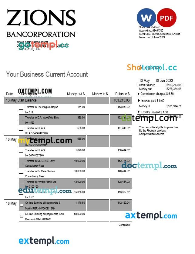 Zions Bancorporation Bank business checking account statement Word and PDF template