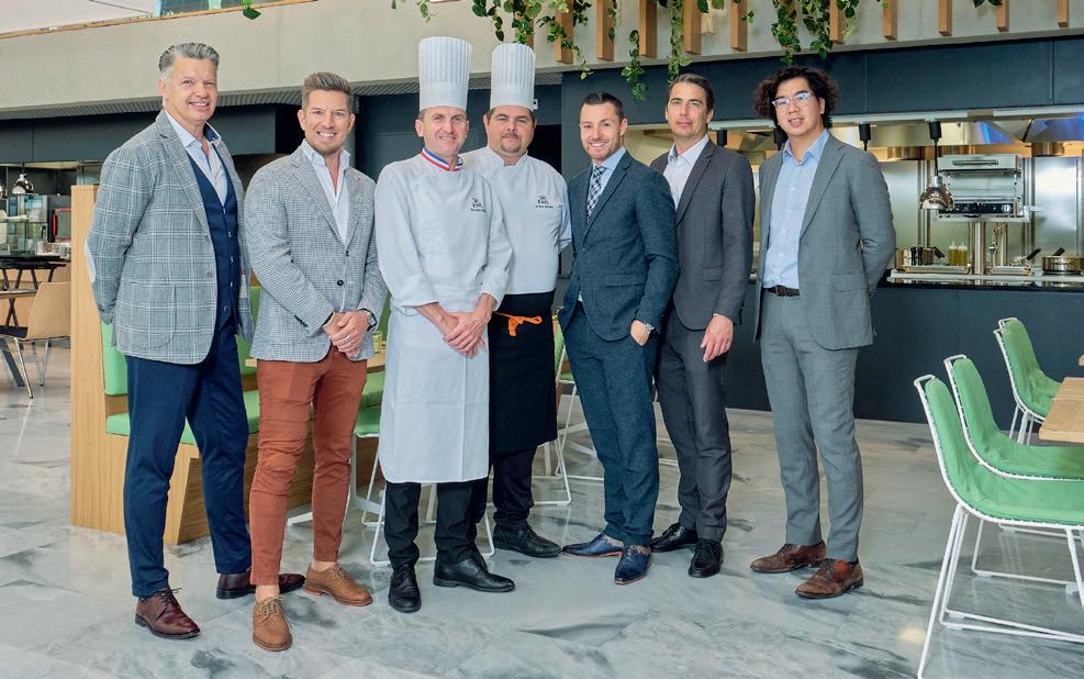 Un partenariat placé sous le signe de la qualité et de l’excellence (de g. à dr.): Roland Astner, Head of Sales Switzerland, et Rares Petruc, Country Manager Switzerland d’Electrolux Professional, entourés de l’équipe de l’EHL composée de Christian Segui, Executive Chef, Jérôme Zbinden, Kitchen Outlets Manager, William François, Director of Business Projects & Hospitality Experience, et Christophe Wang, Infrastructure Development Manager, ainsi que de Jean-Pierre Schumacher, Area Sales Manager d’Electrolux Professional (2e depuis la droite).