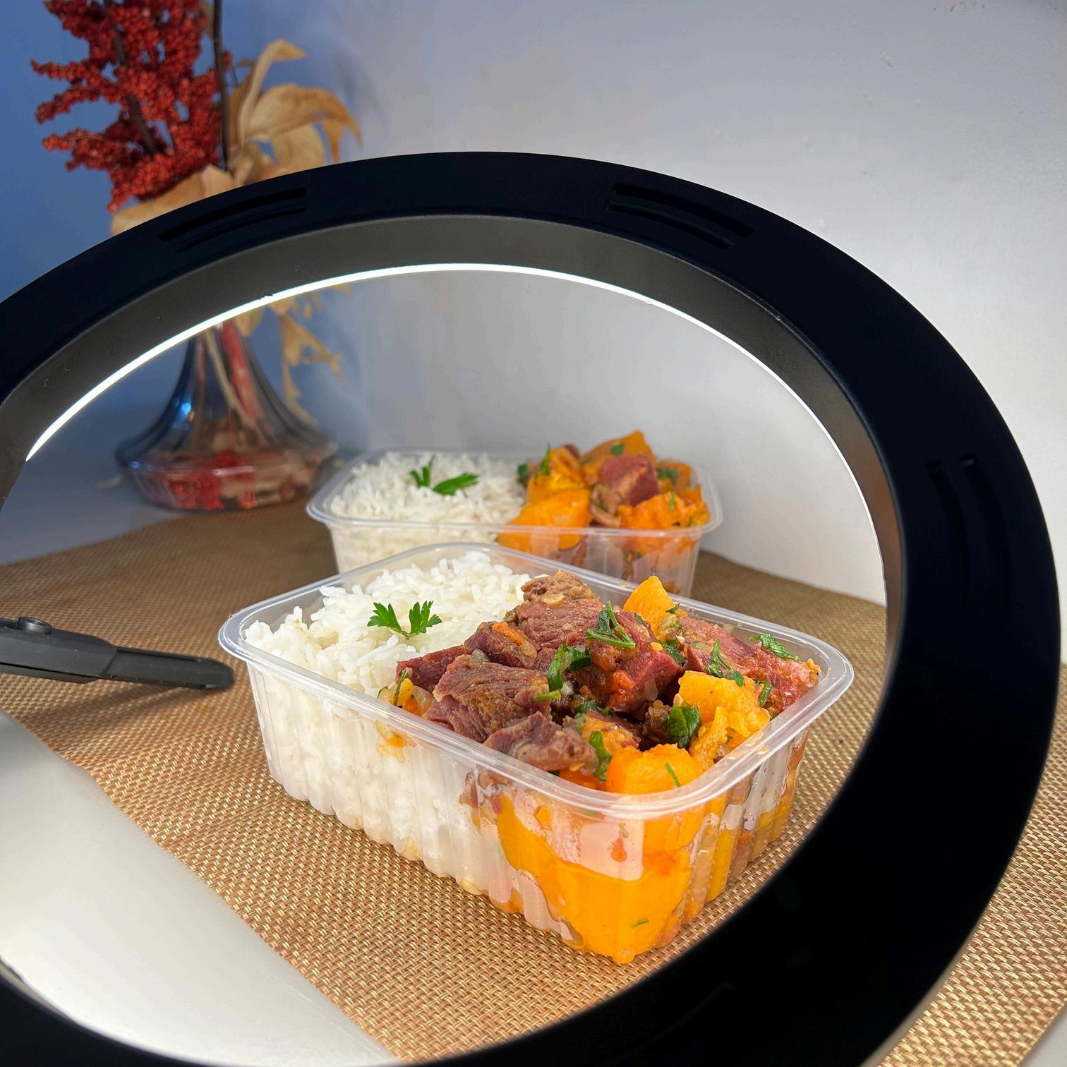 Carne seca c/ abóbora e arroz branco refogado com alho.