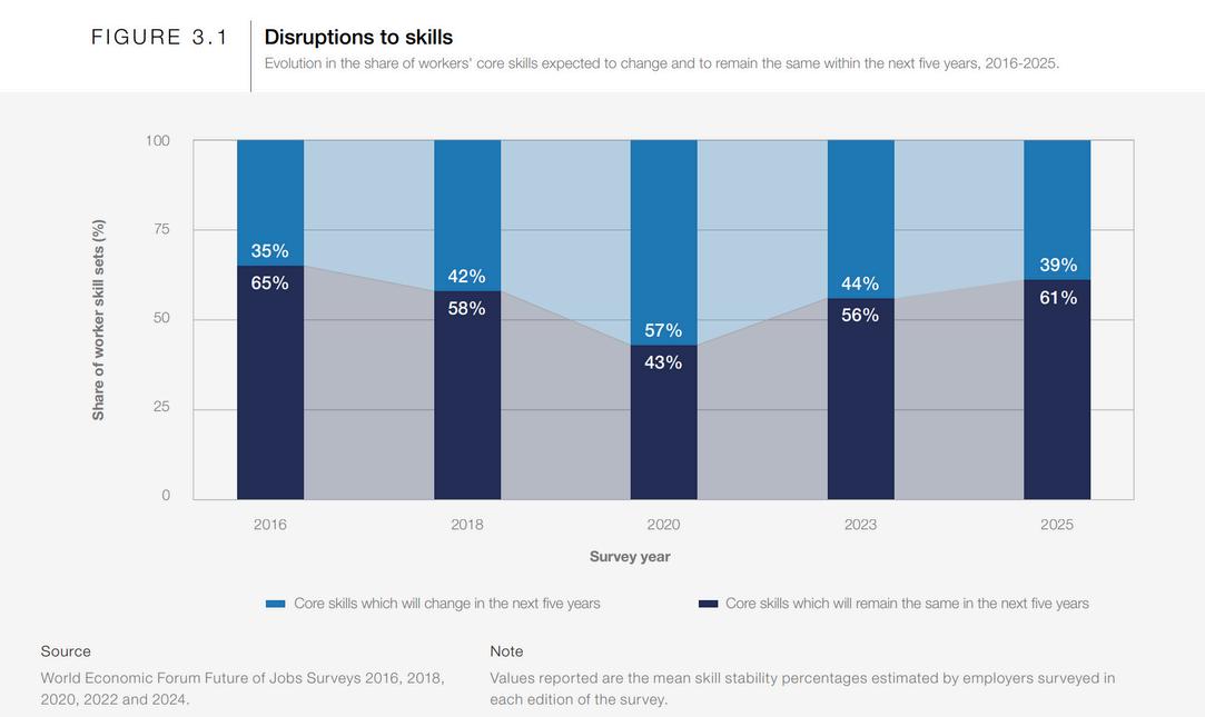 The report indicates that 39 per cent of workers' core skills are expected to change by 2030 This represents a significant, albeit slightly reduced, level of disruption compared to previous years