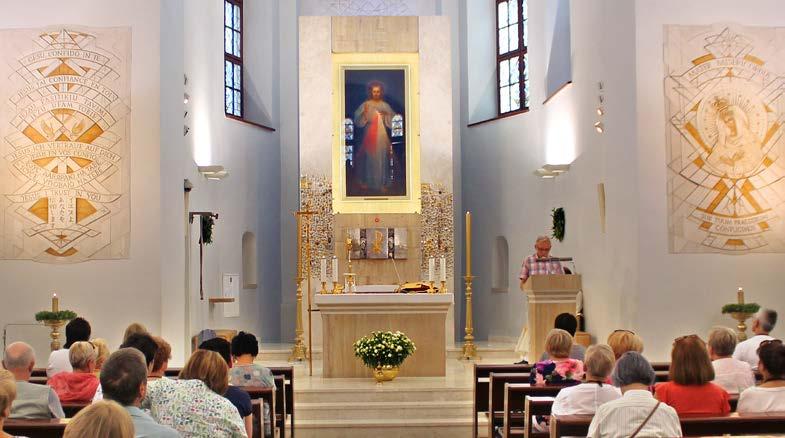Erfahren Sie im Heiligtum der Barmherzigkeit Gottes die Segnung Jesu: Auf dem Bild segnet die erhobene rechte Hand des Erlösers all jene, die ihm vertrauen, und die linke Hand berührt sein Gewand am Heiligen Herz, wobei er seine Gnade verbreitet, reinigt und der Seele Leben einhaucht. Pilger sind hier stets willkommen: Im Heiligtum findet rund um die Uhr die Verehrung des Heiligen Sakraments statt.
