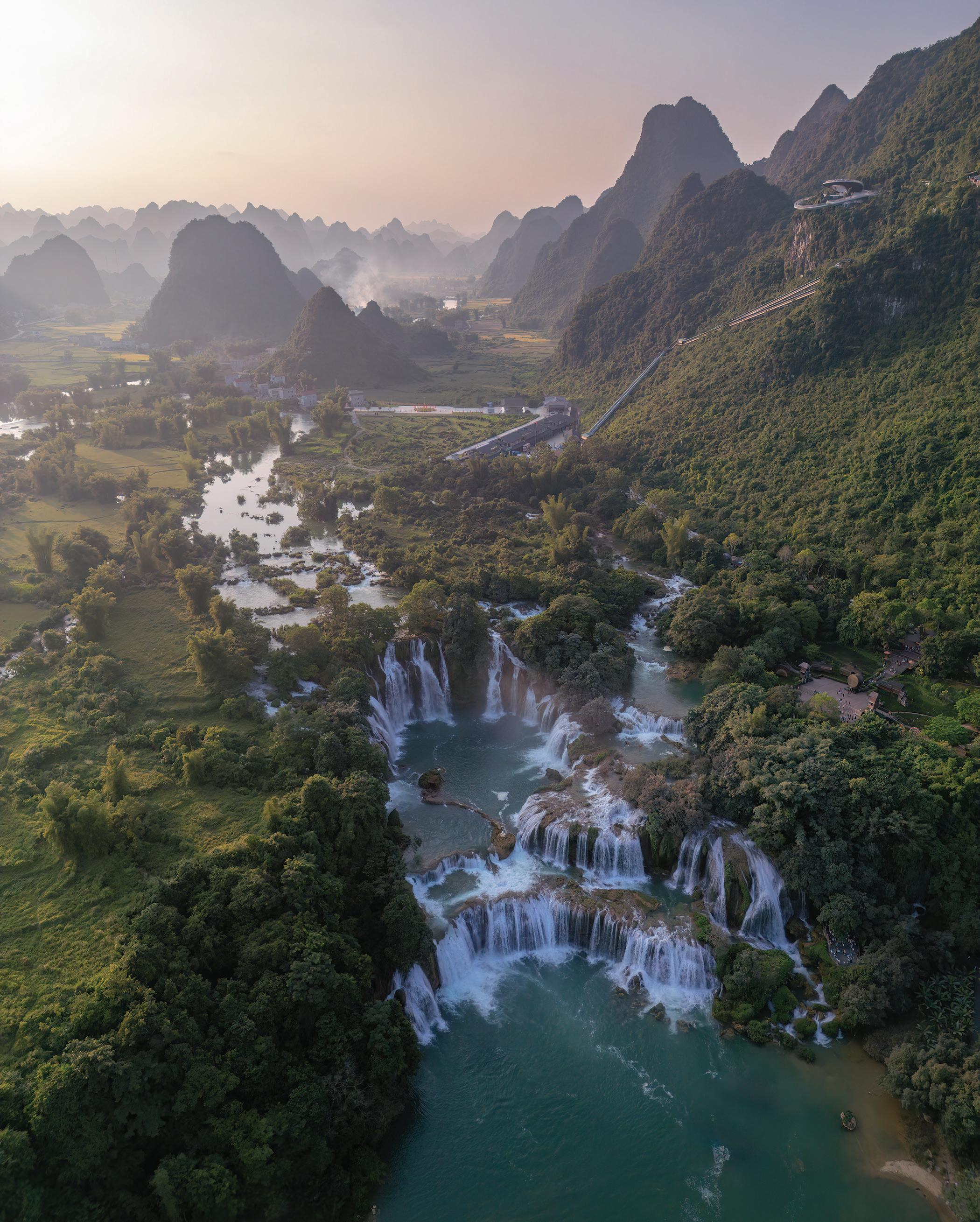 Ban Gioc Falls cascades through various segmented levels of the karst hills along the border between Vietnam and China.