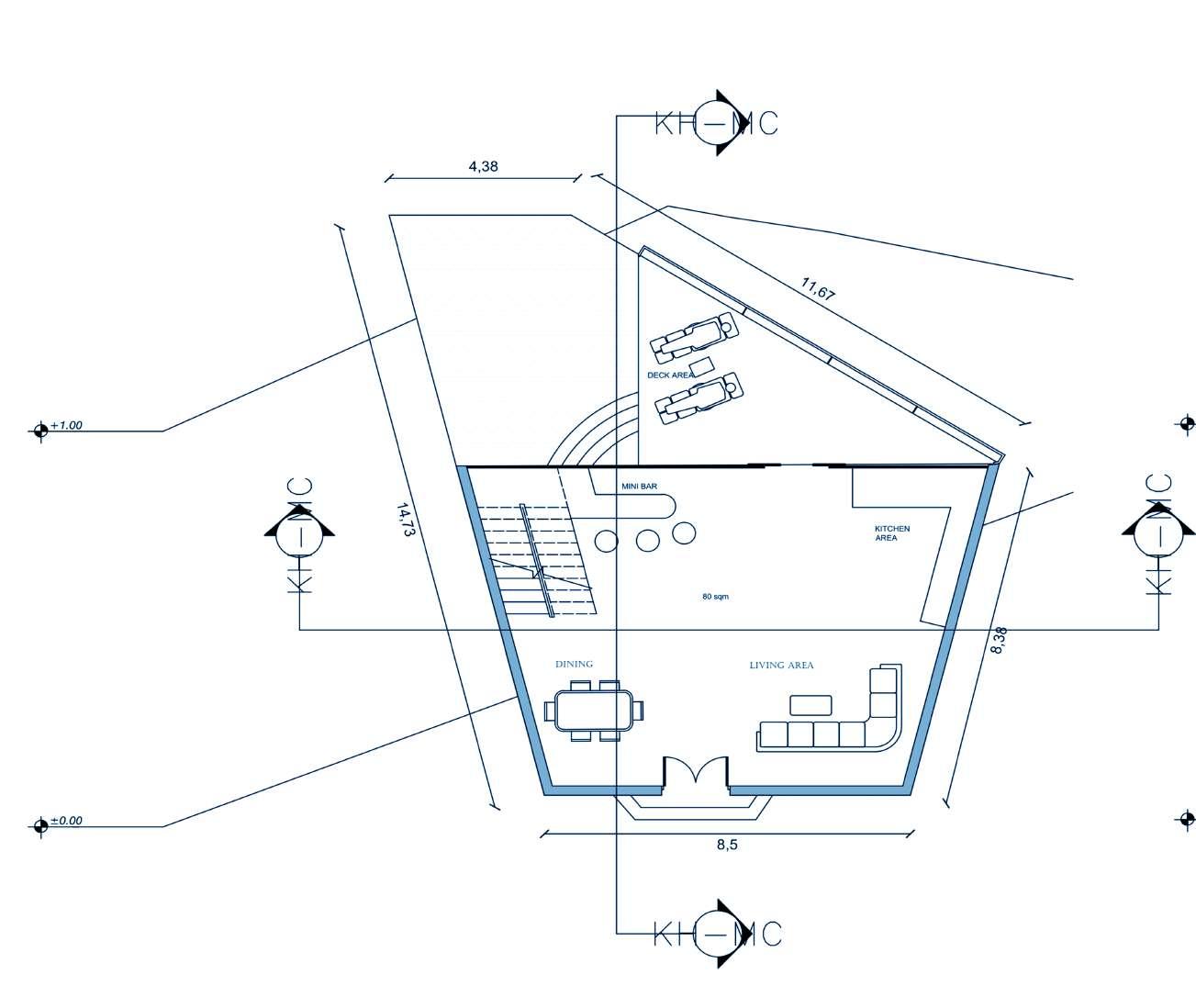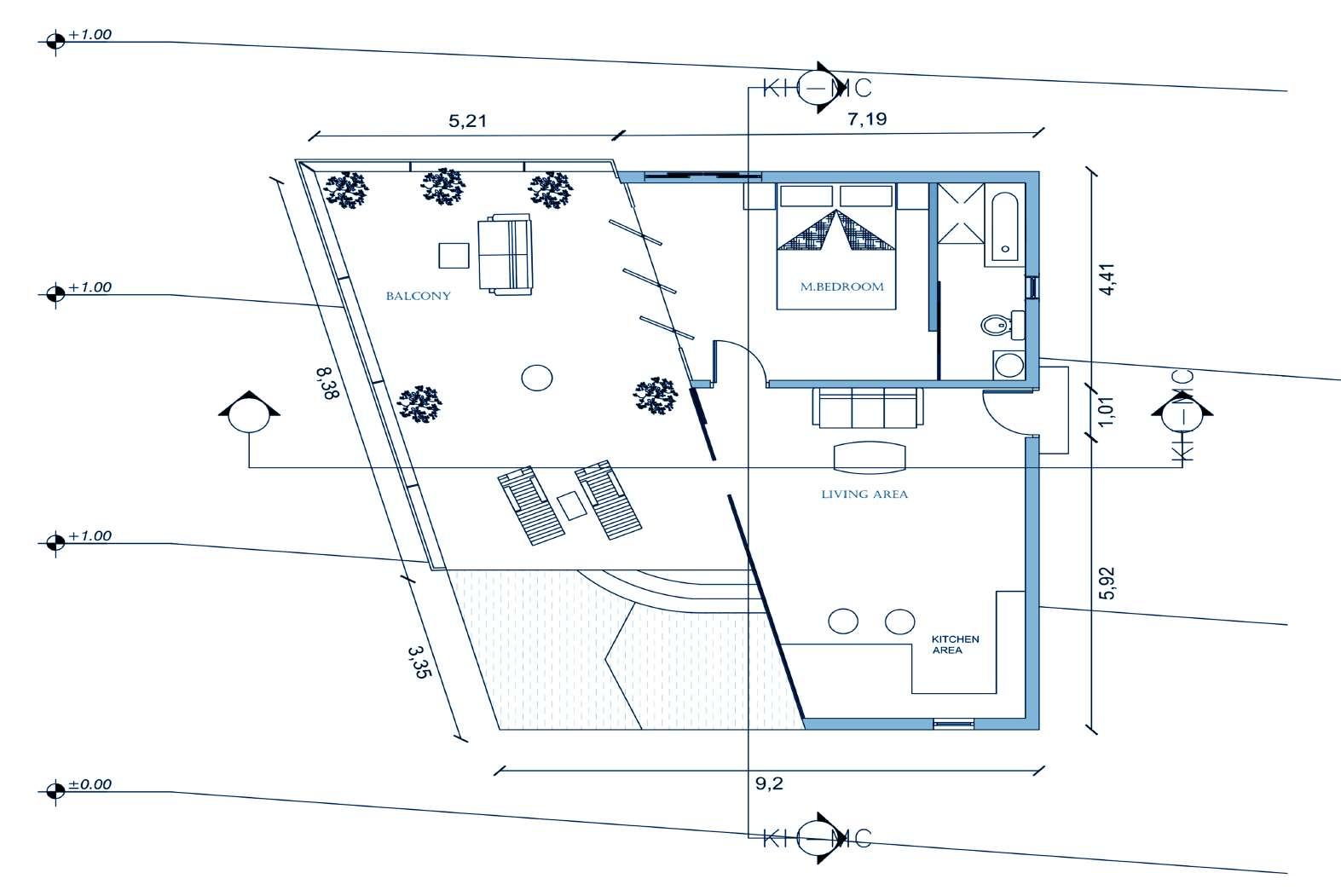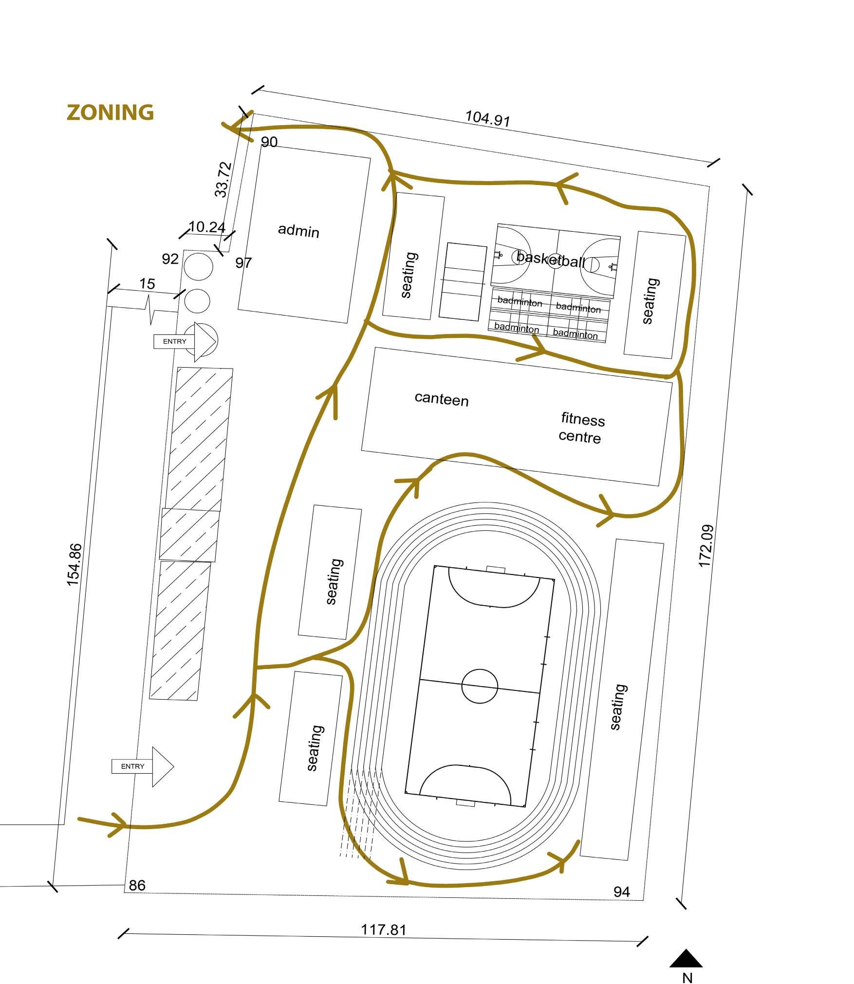 • Using glass walls for providing transperancy. Positioning the elongated span along the steeper side to enhance the sceneinc view.
