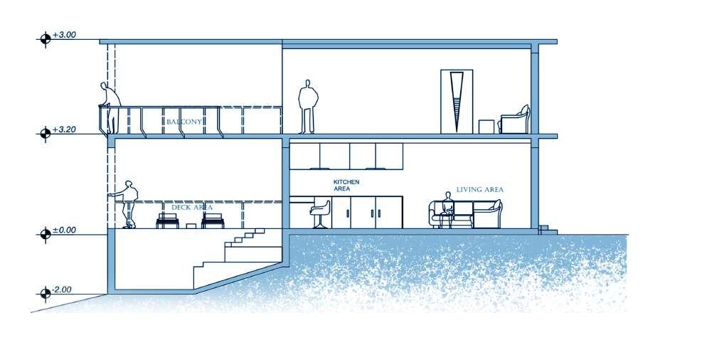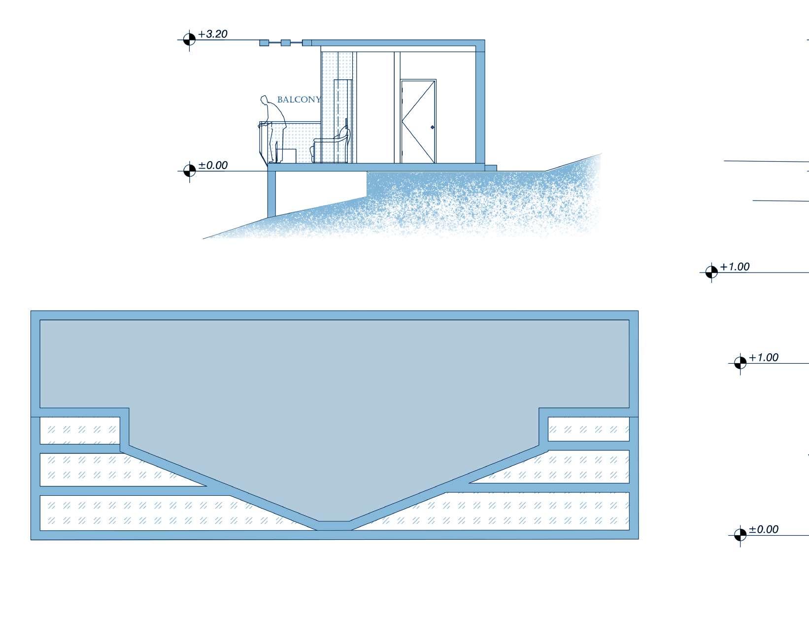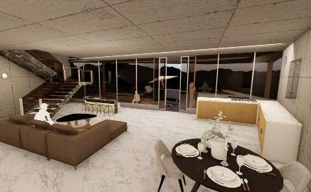 • The concept focuses on transparency, achieved through the design of translucent glass skylights in the balcony area.