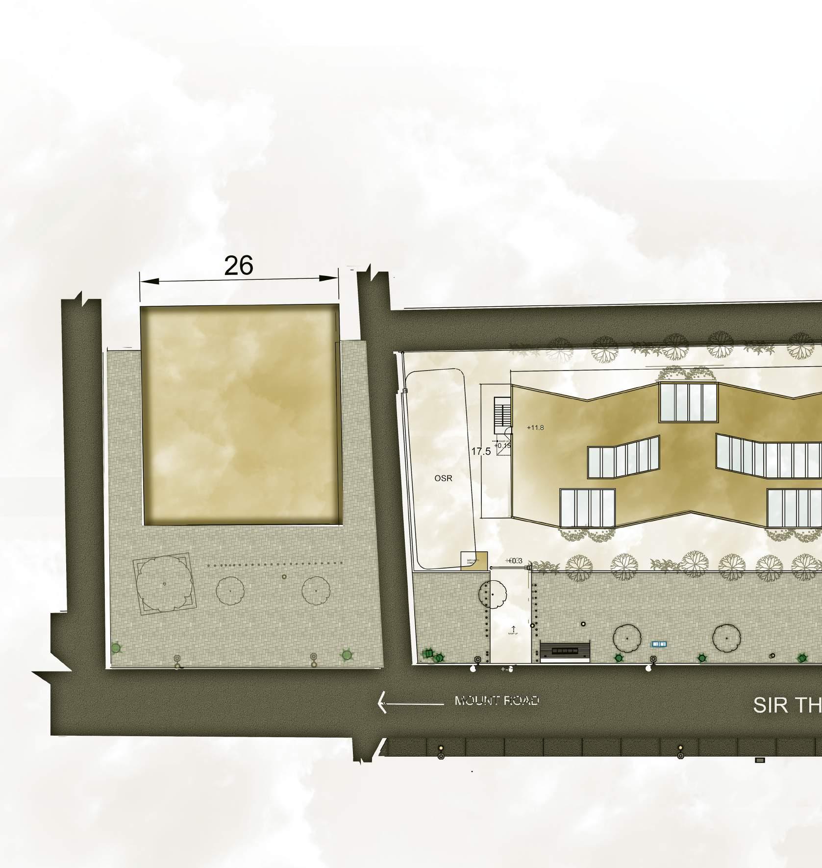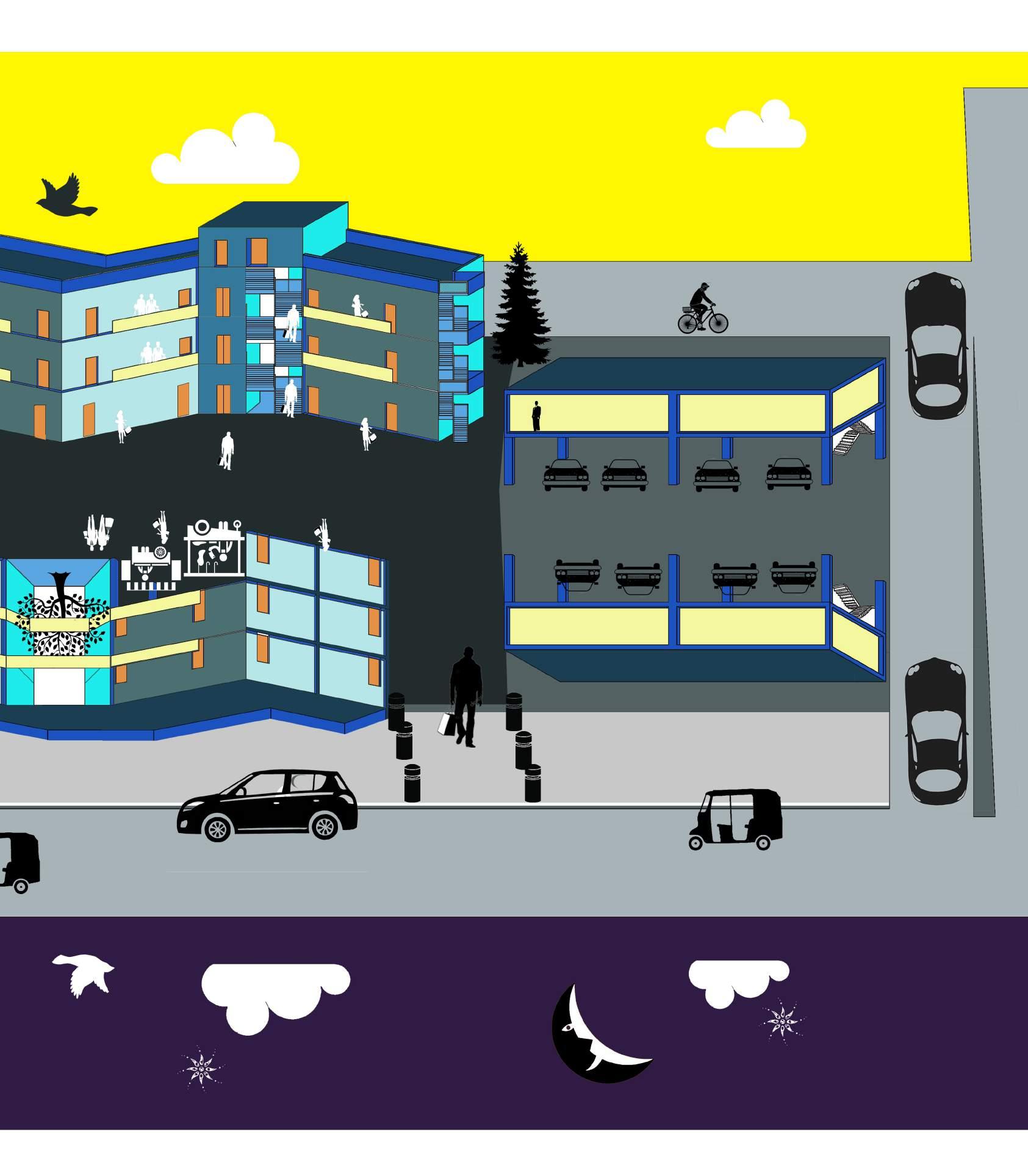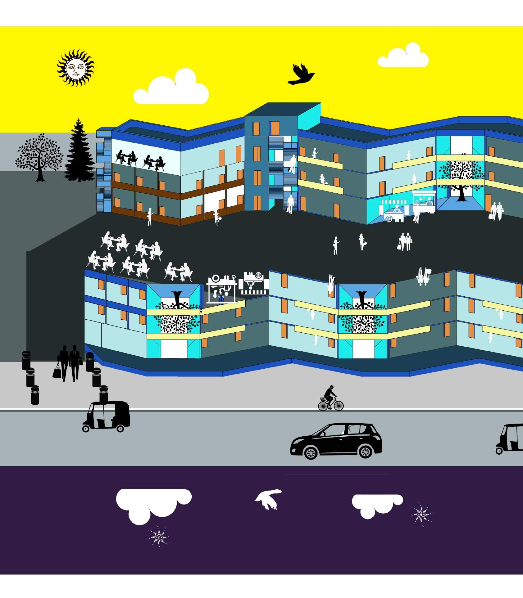 PROVIDING CANTILEVERD SPACE IN BETWEEN FLOORS FOR LANDSCAPE AND CROSS VENTILATION AND SCEESS IN SIDE THE COMMUNITY MALL