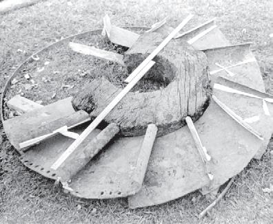 Most unusual was the walnut water turbine wheel (shown above). Apparently the wheel was powered by centrifugal force. The water was channeled into the center of the wheel and forced outward through the open ended water wheel paddles. There may also have been a flywheel apparatus designed to assist the centrifugal forces involved. Apparently the wheel balanced on a center upright spindle and wear was evident on the encompassing timbers. The wheel set clear of the shale bedrock, resting three feet below the top of the walnut floor joists. The wheel was tapered from center to outside perimeter, made of two layers of wood and cross-pegged to add power to the turbine.
