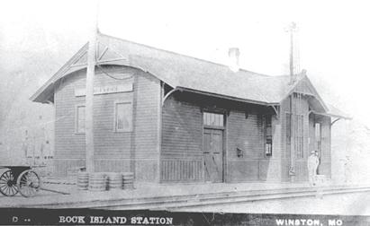 This is the Rock Island train depot in Winston, MO, where James Gang members embarked in order to pull off their 1881 robbery. The depot was built in 1871 on a high point in Daviess County, halfway between Gallatin and Cameron. The first station agent was T.F. Jefferies, a native of Somersetshire, England. Two sets of tracks fronted the depot and were used for switching cars while a set of siding tracks ran behind the depot.