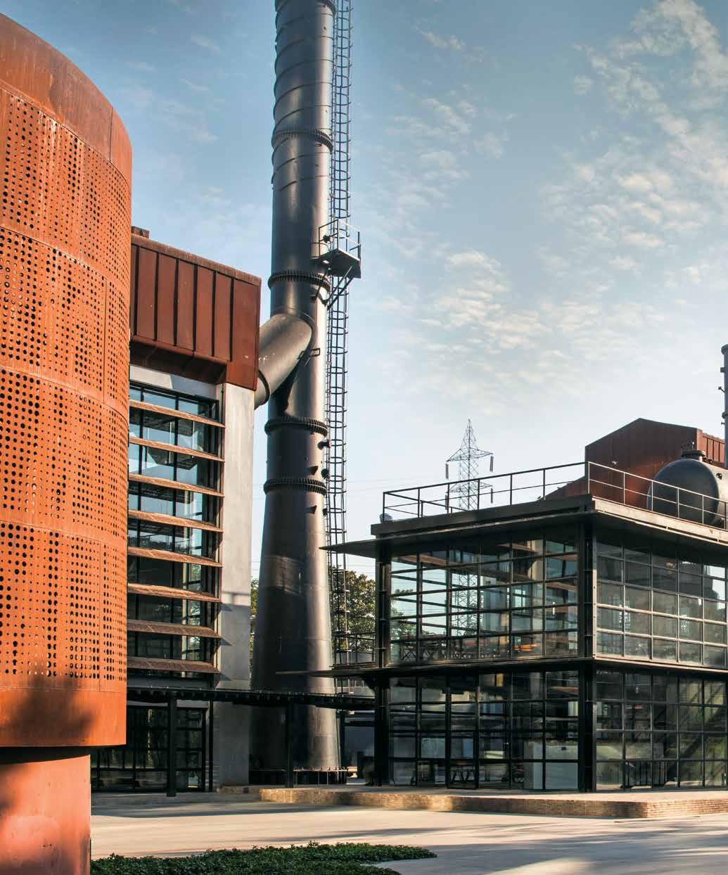This complex consists of two erstwhile power cogeneration plants which have been transformed into the gallery and exhibition spaces; a boiler converted to a cafe; a Wi-Fi enabled public plaza marked by a tall chimney; a legacy park with public art installations; an open air theatre; market plaza and its own small urban farm.