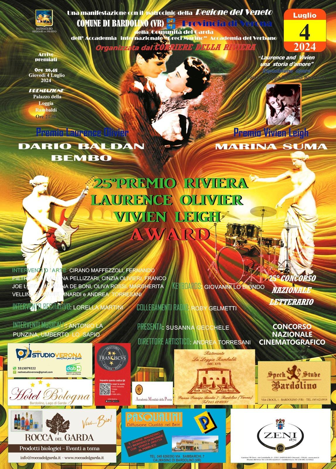 Dario Baldan Bembo e Marina Suma premi alla carriera Laurence Olivier e Vivien Leigh rispettivamente innanzi al numeroso pubblico intervenuto alla Loggia Rambaldi di Bardolino, il 4 luglio scorso. In un contesto spettacolare ha preso il via alle 20,45 l'edizione stellare del Premio Riviera dove big hanno assistito alla premiazione dei concorrenti del venticinquesimo concorso letterario nazionale. Susanna Gecchele e Andrea Torresani rispettivamente presentatrice e direttore artistico della manifestazione hanno dato il via alla kermesse che ha visto premiati una decina di concorrenti del concorso letterario nazionale presenti in sala : Francesco Monti, Adriano Moruzzi,Alberto Pedrazzini,Carlo Rossi e Alessia De Togni. Prima di questi però grande interpretazione di Umberto Lo Sapio con la canzone de Il Volo “Capolavoro” che ha fatto decollare la manifestazione con la consegna dei riconoscimenti previsti. Dopo la recita delle poesie da parte della brava Lorella Martini, ha preso il centro del palco Dario Baldan Bembo con la hit “Tu cosa fai stasera”. Al termine scroscio di applausi con il coro del pubblico che cantava la nota “Amico è” inno dell'amicizia. “Sono orgoglioso - ha detto Dario - di ricevere questo riconoscimento nel quarto di secolo della manifestazione. Ringrazio gli organizzatori di questo contesto che ricorda il noto attore Laurence Olivier, di cui sono oggi testimonial rappresentando la continuità artistica di questa kermesse”. E’ salita poi sul tappeto rosso l'attrice Marina Suma che ricevendo il Premio Vivien Leigh ha detto:”Sono arrivata qui sul Garda grazie alla giuria del premio che ha saputo riconoscere la mia attività cinematografica e televisiva. i tempi dei film “Sapore di sale” e “Sapore di mare” a cui partecipavo sembrano conclusi sia cinematograficamente che nella vita reale. Oggi sono impegnata televisivamente e soprattutto in teatro”. Dopo l'applaudito intervento musicale di Antonio La Punzina, sono entrate in scena le