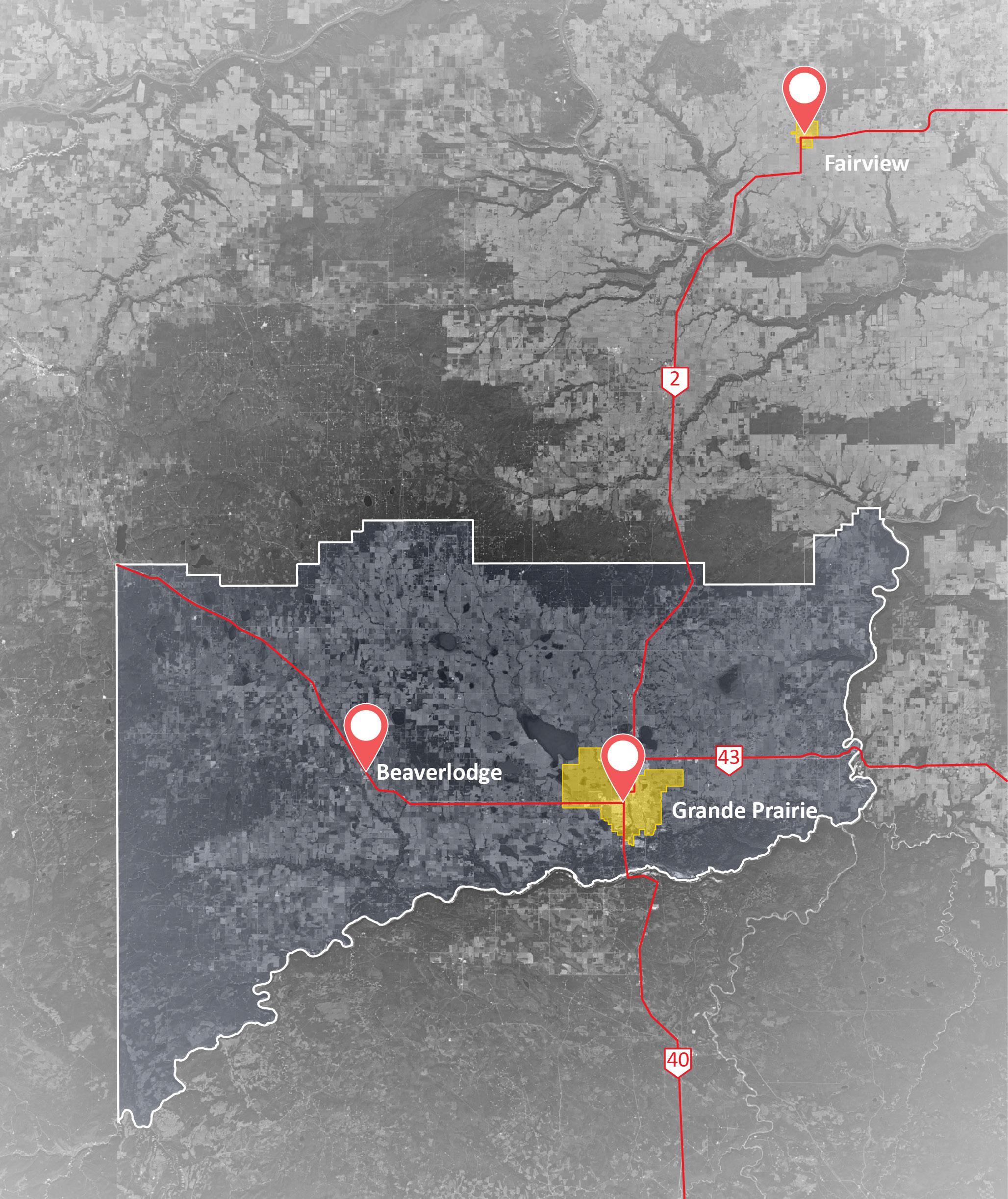 Northwestern has property holdings in three communities in northern Alberta. The Institution has two academic campuses located in Grande Prairie and Fairview (460 km and 550 km northwest from Edmonton, respectively), and a research facility in Beaverlodge (40 km west of Grande Prairie). These campuses are in the Peace Country of Northern Alberta, the northernmost farming region in North America. As the largest city north of Edmonton, Grande Prairie houses Northwestern’s Grande Prairie campus, offering academic and trades programming to students. The Grande Prairie campus is situated at the northeast intersection of 100 Avenue and 108 Street and is surrounded by commercial uses to the west and south, single family residential to the east, and Bear Creek Reservoir to the north.