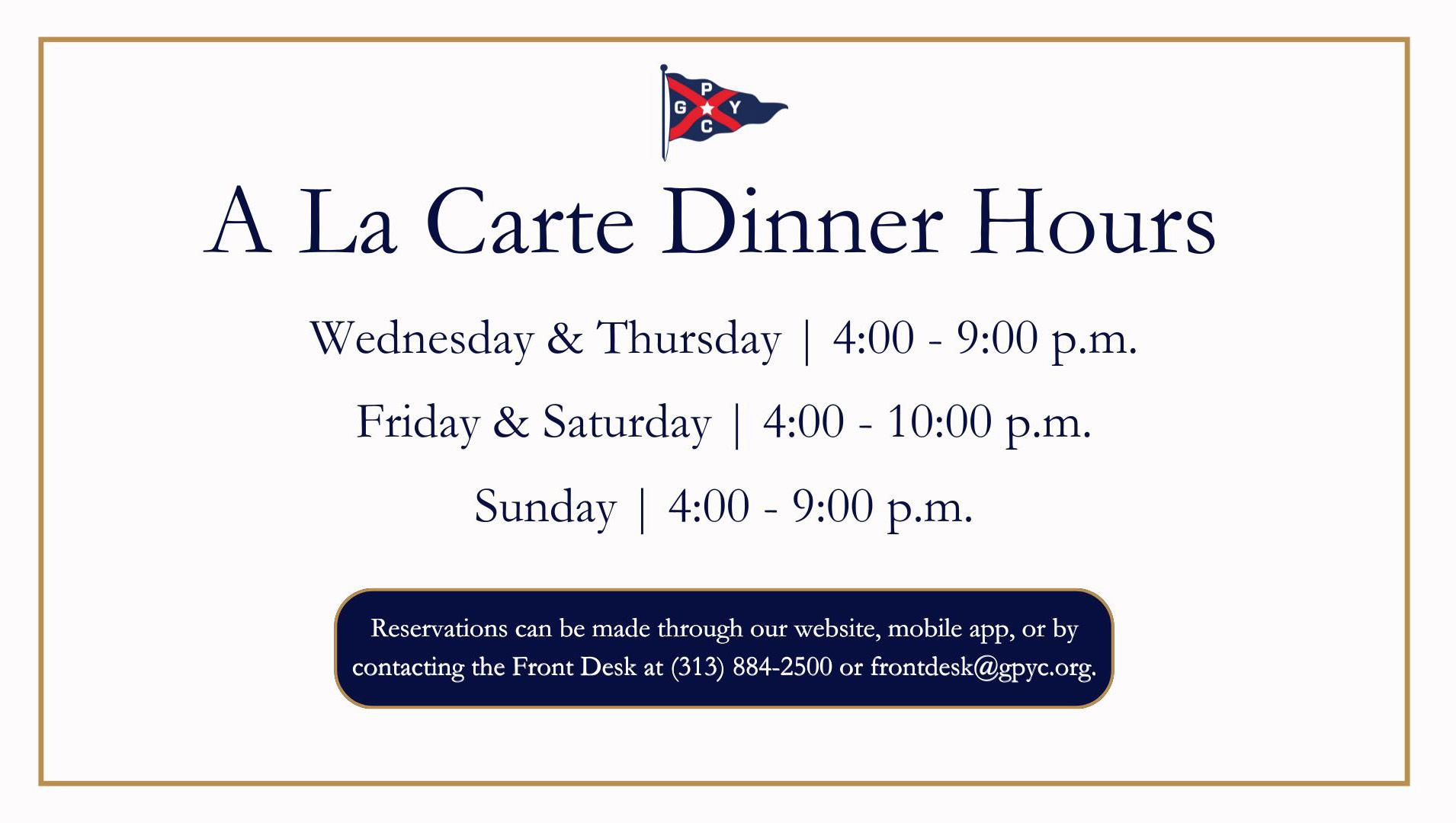 A La Carte Dining is available Wednesday through Sunday at the Club for dinner. Please be sure to check The Weekly Buzz and other publications for dining hours and dining rooms available.