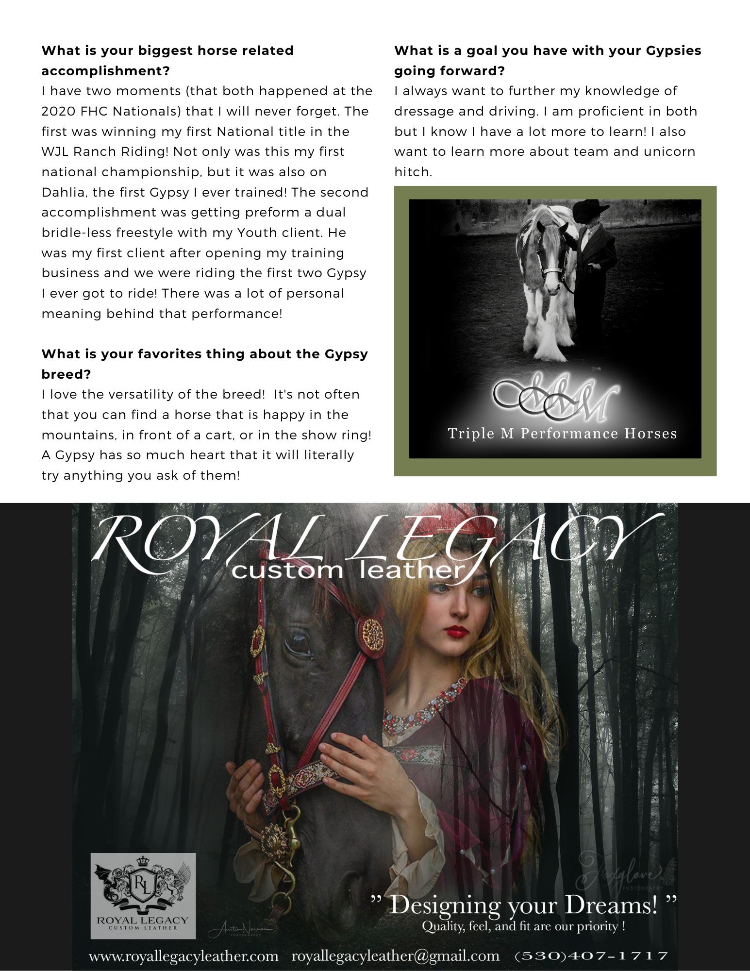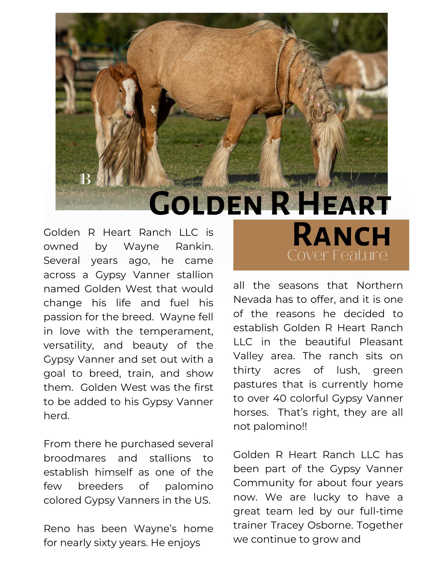 Thankyouonceagaintoeveryonefor yourcontinuedsupportofthismagazine. Thevisionfromit'screatorswasaplace forallloversandadmirersofthis amazingbreedtocometogetherand celebratewhatmakesaGypsyhorse trulyspecial. Ourgoalisnottodividethebreedbased onaname,butinstead,tountieallof thosewhoappreciatethisbreedofhorse thatwasstartedintheUnitedKingdom, andhasnowmadeit'swaytomany countriesoftheworld. Withourfirst editionreceivingviewsinover20 differentcountries,weknowthatwe havestartedtoachievejustthat. Welookforwardtobriningyoumore editions,includingournextedition, January2023-AFocusonStallionsand BreedingSeason