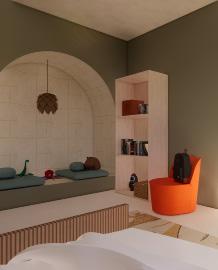 The tactical experience through the home was a major key in designing for a visually impaired occupant, Yousef. It was important within this home to have high contrast of colors, materials, and furniture so Yousef can tell things apart just by touching them. We played around with different textures of wall coverings, soft and hard furniture, and high contrast colors within his bedroom. Below shows different spaces with different materials and furniture.