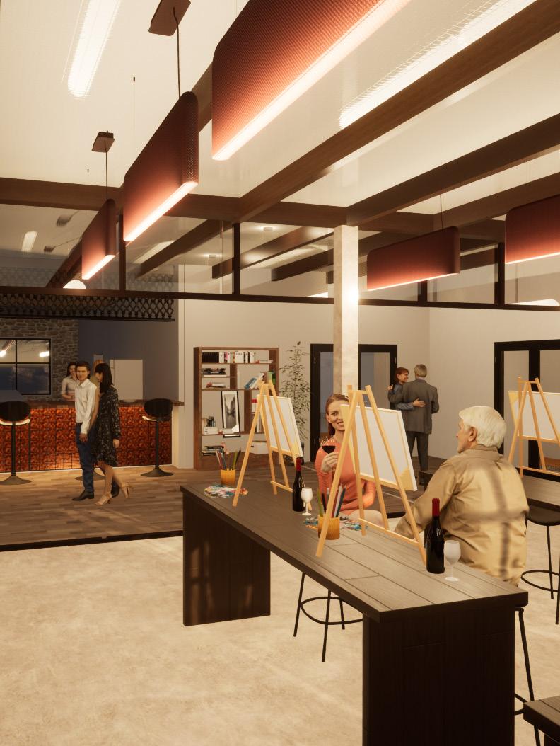 MOMO is envisioned to be a dynamic masterpiece that seamlessly merges various art forms, fostering collaboration and interaction among artists and audiences alike within the Lawrence community. We aim to preserve the original framework. This innovative space is designed to pay homage to the Lawrence arts district and local artists by focusing heavily on location and user needs. We aim to create a point of convergence for all creative minds to work together in building a central hub, all in all creating a lively environment that celebrates