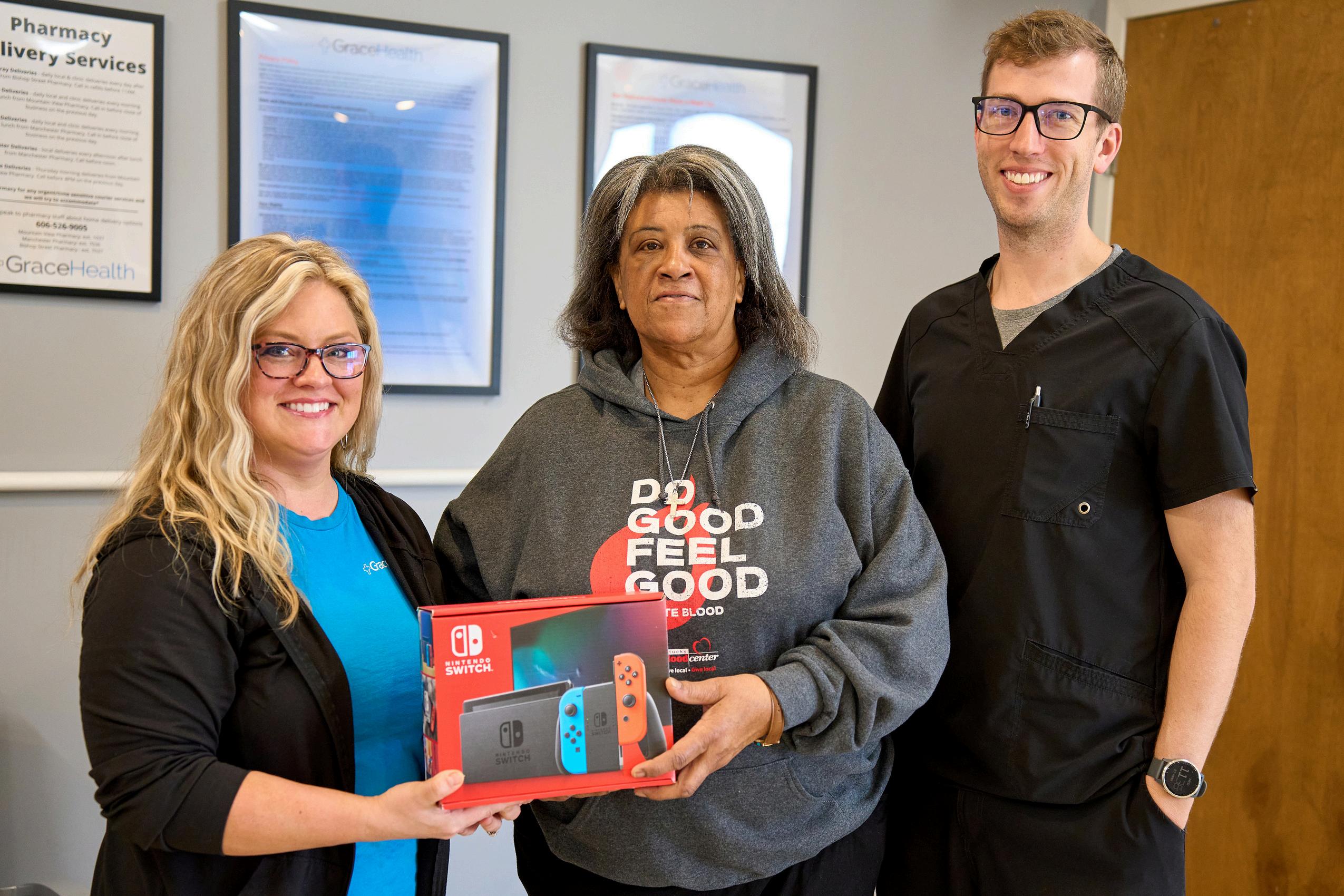 Larry Burchett, pictured above left with Rebekah Riggs, MSHHP, PR Specialist, was the first winner drawn for the Nintendo Switch console. He was elated to win, sharing that his granddaughter’s birthday party was happening later that evening and she had asked for a