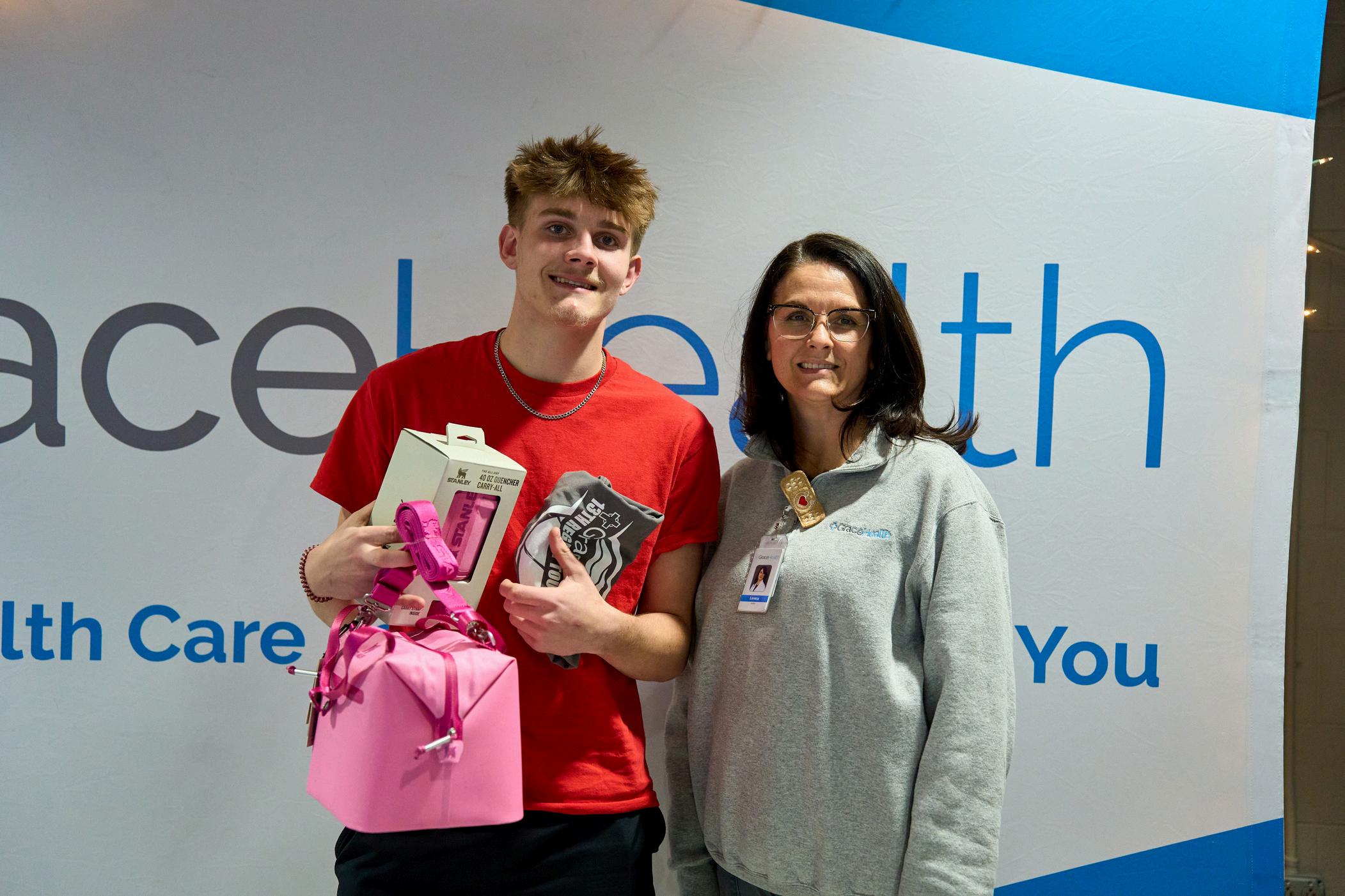 Karsyn and Jenna were surprised to receive the winning calls neither had entered more than once! Jenna even shared that she had never won anything before in her life. Meanwhile, Lauren, pictured with Dalice Roberson, PA-C, had to wait until after cheering the Jaguars to a regional title before claiming her prize. Maddox, thrilled to receive his bundle from Loretta Wilson, APRN, excitedly shared that he planned to gift it to his mom for her birthday.