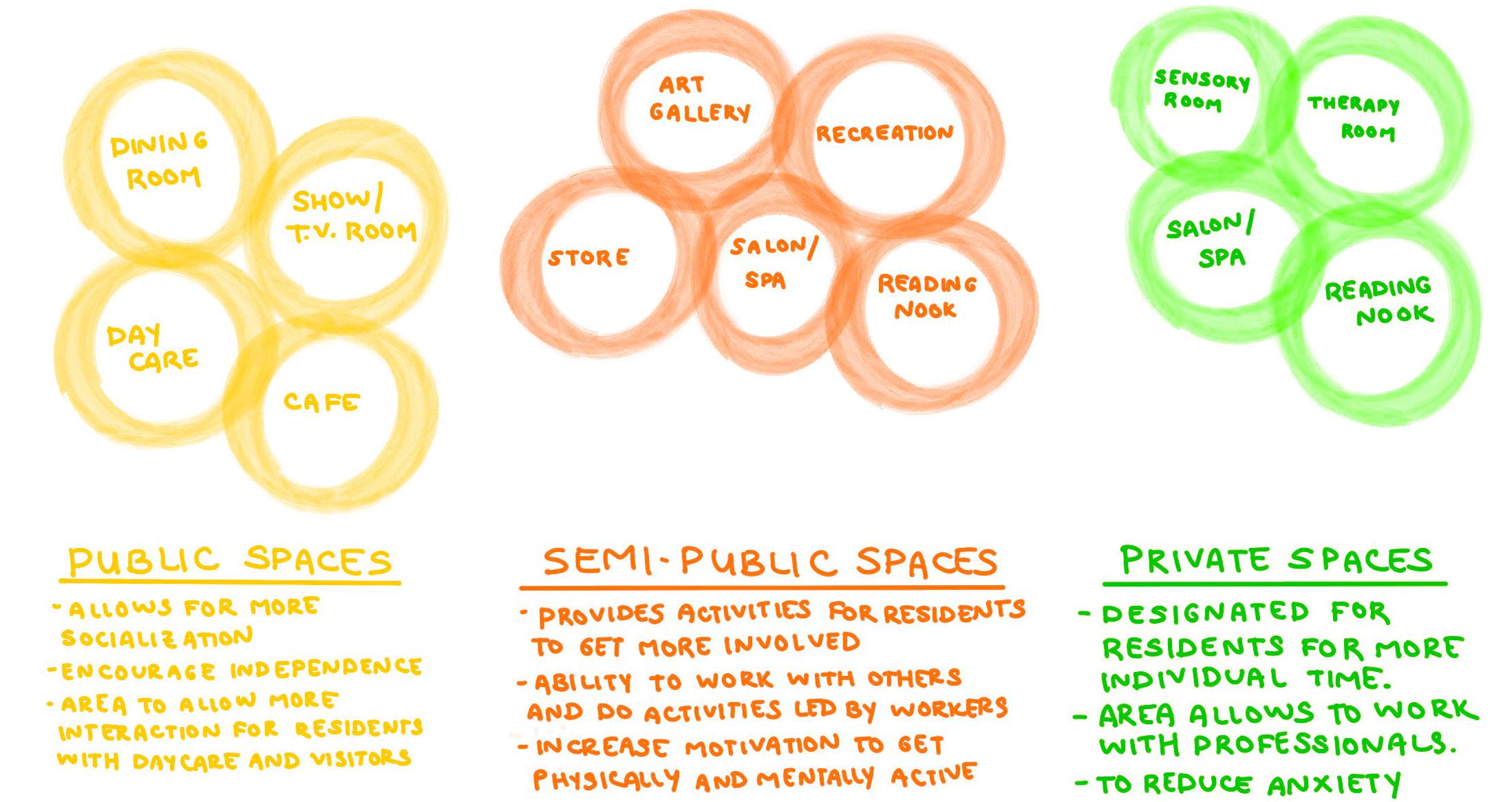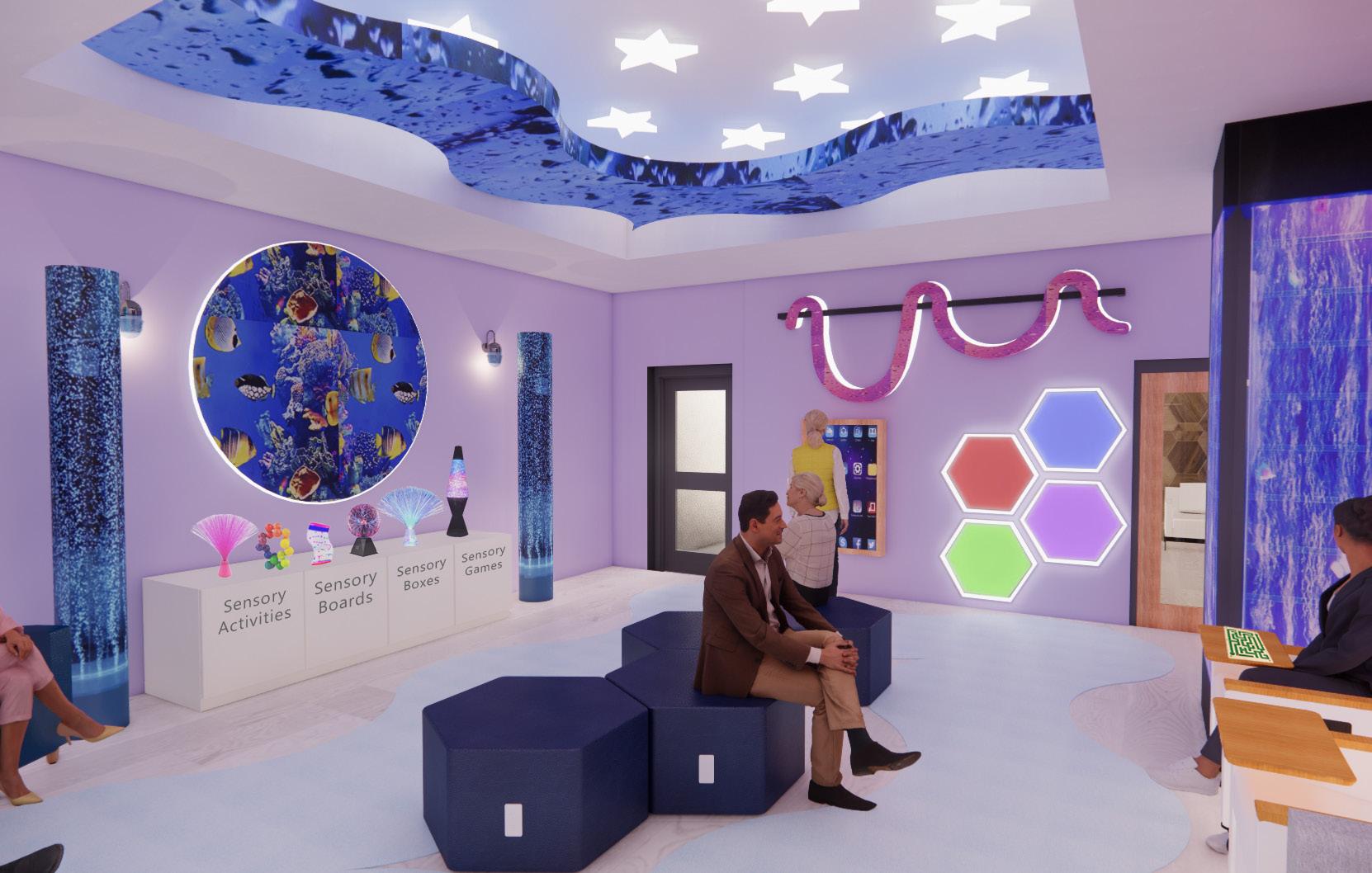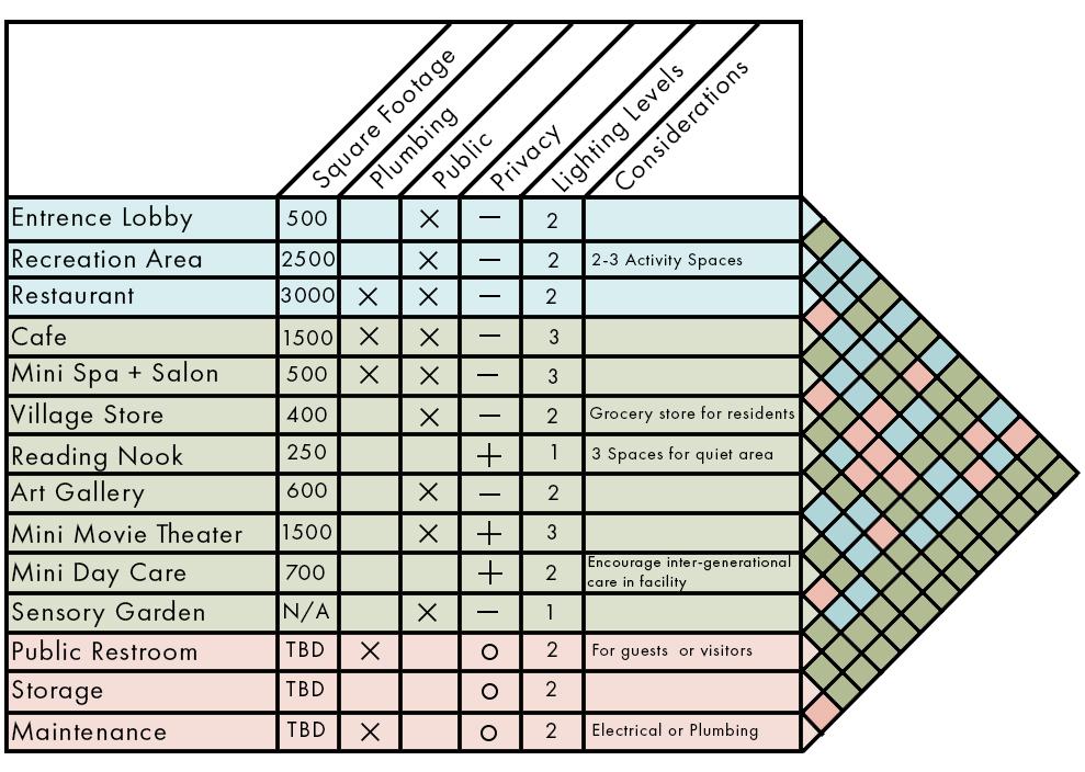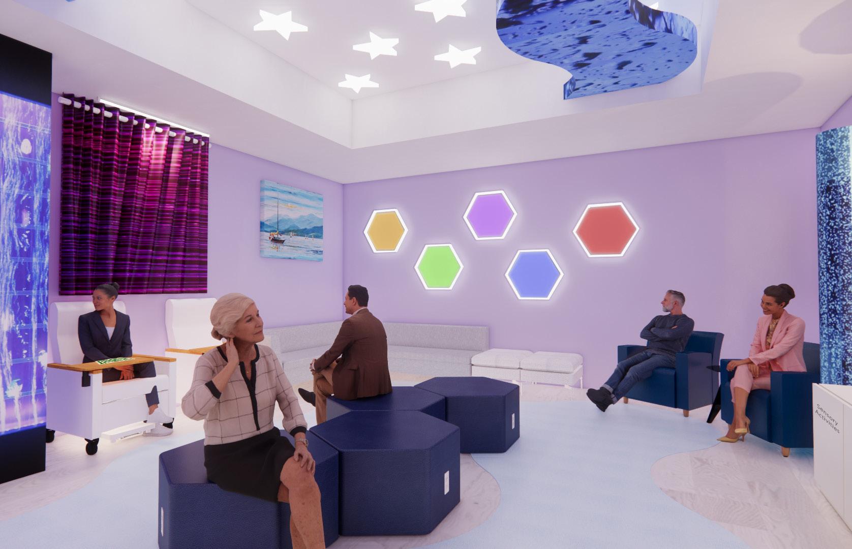 When Alzheimer’s patients are moved into memory care, their sense of home and belonging becomes lost, which can lead patients to become less motivated to do daily tasks. When users enter the space they should feel like they belong in this new environment they will soon call home. Throughout the building there will be sensory activities that will help them get physically active, improve cognitive ability as well as memory, and use their fine motor skills. The goal is to ensure patients are comfortable and feel like they still have a sense of control and independence with all the provided amenities they can do that will keep them active physically and mentally.