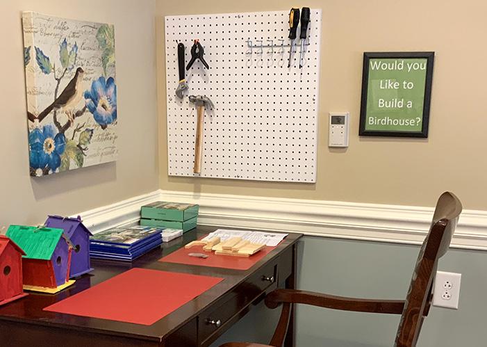 An area to read alone or with others and a place to wait before appointments For residents to work one on one with a licensed physical therapist. Located by therapy for extra therapy