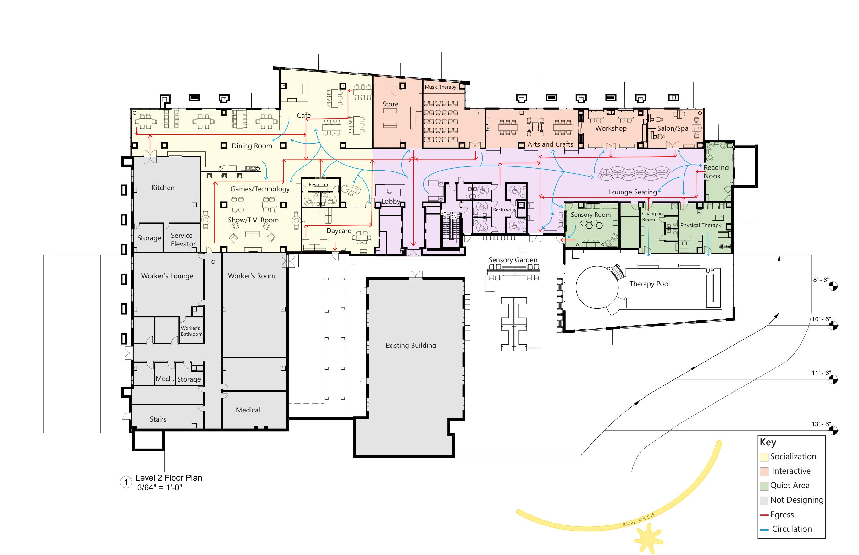When Alzheimer’s patients are moved into memory care, their sense of home and belonging becomes lost, which can lead patients to become less motivated to do daily tasks. When users enter the space they should feel like they belong in this new environment they will soon call home. Throughout the building there will be sensory activities that will help them get physically active, improve cognitive ability as well as memory, and use their fine motor skills. The goal is to ensure patients are comfortable and feel like they still have a sense of control and independence with all the provided amenities they can do that will keep them active physically and mentally.