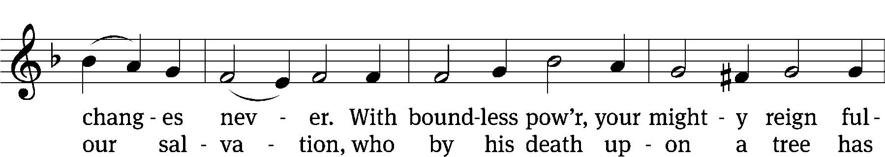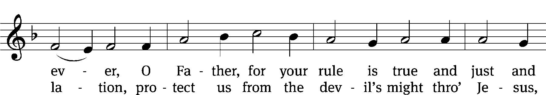 Our Father in heaven, hallowed be your name, your kingdom come, your will be done on earth as in heaven. Give us today our daily bread. Forgive us our sins, as we forgive those who sin against us. Lead us not into temptation, but deliver us from evil. For the kingdom, the power, and the glory are yours now and forever. Amen.