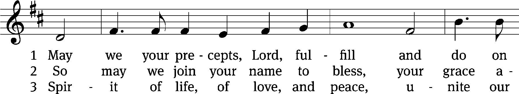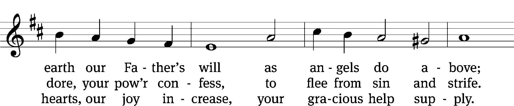 Our Father in heaven, hallowed be your name, your kingdom come, your will be done on earth as in heaven. Give us today our daily bread. Forgive us our sins, as we forgive those who sin against us. Lead us not into temptation, but deliver us from evil. For the kingdom, the power, and the glory are yours now and forever. Amen.