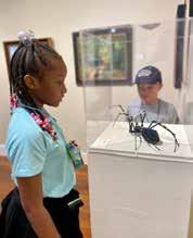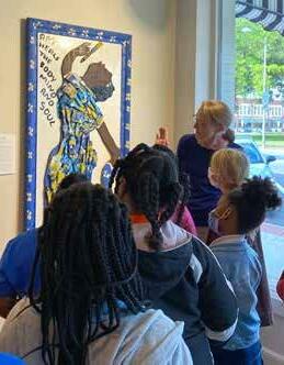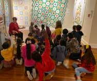 Above: Museum Educator Sarah Black-Sadler guides a discussion of the Marvelocity exhibition with students from W.T. Moore Elementary School; right: Teen Aide Zoe Ford helps a student create prints during Summer Art Camp. Facing page: artist Eluster Richardson talks with students during a Field Trip from Ruediger Elementary School.