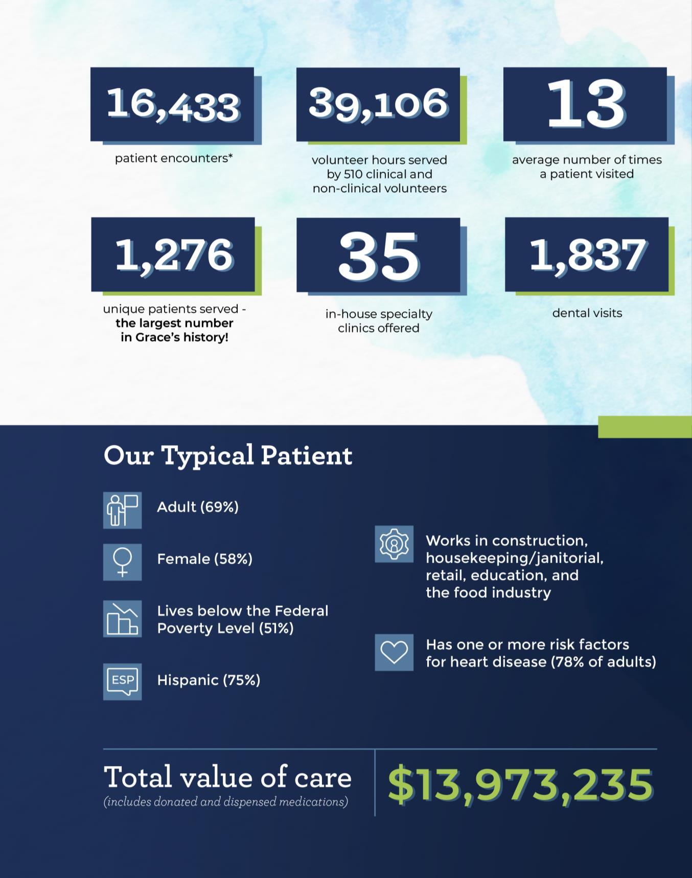 Discovering our patient’s unique challenges has provided the chance to expand needed services such as mental health, wellness and mobile care often times inaccessible aspects for the low-income, uninsured members of our community. We cared for a record number of patients this year 1,276 patients. Each of their stories about their journey to Grace is special and poignant.