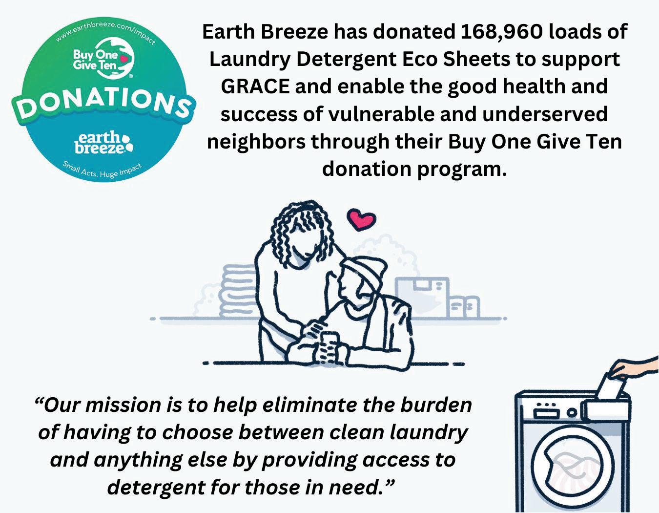 In collaboration with the Summit Schools, we turned hygiene, the top reason for truancy, into the easiest problem to fix.Thanks to EarthBreeze laundry sheets, GRACE provides regular support with access to clean laundry and detergent. GRACE distributed laundry detergent to families in 2023, equivalent of 168,960 loads of laundry.