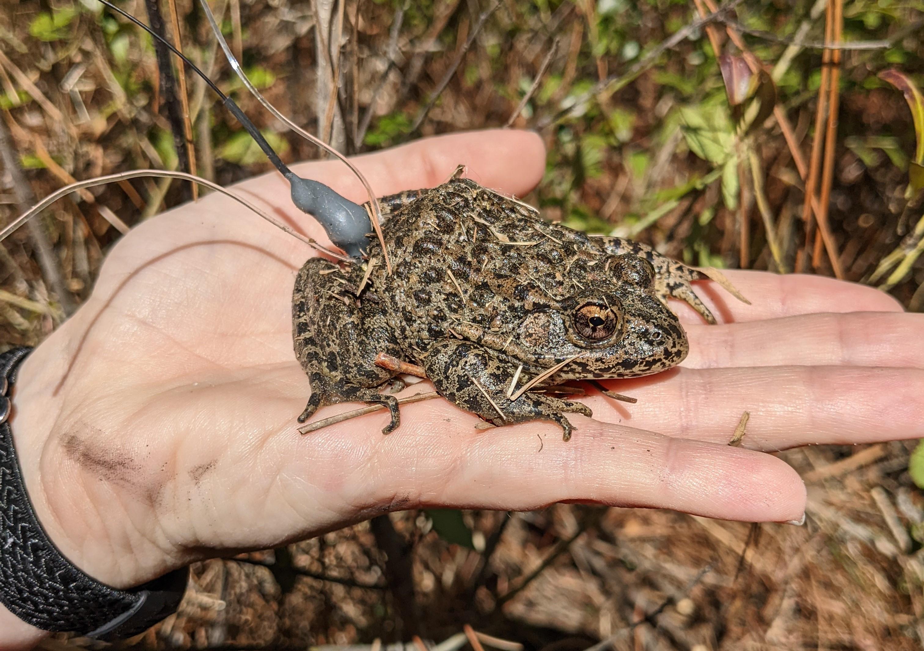 Gopher frogs are a species in decline in the southeastern United States. These frogs spend most of their lives underground in burrows in longleaf pine savannahs, emerging each year to migrate to breeding ponds in late winter. As part of a multi-state effort to learn more about the movements and upland habitat uses of this rare species, I place radiotransmitter belts on frogs leaving breeding ponds in Alabama. More than just a froggy fashion accessory, these belts allow me to track where the frogs are going and what natural features the frogs are using in the landscape. By monitoring the movements and microhabitat uses of gopher frogs, we can work towards habitat management strategies, restoration efforts, and reintroduction of frogs within their historic range. This particular frog was resting under pine straw during its 1.5km journey to its cozy stump hole home in the uplands.