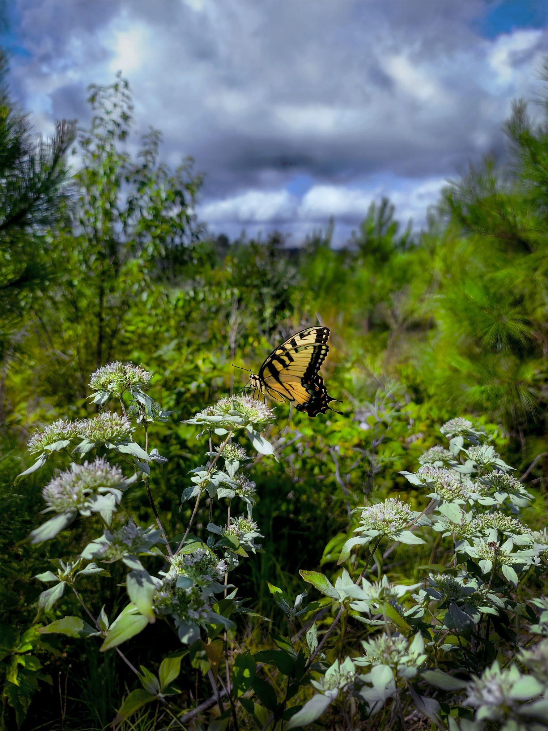 This photo showcases an example, where the blooms of a shadeintolerant mountainmint plant provides nectar for a tiger swallowtail butterfly. Mountainmint cannot grow well under the shade of a dense tree canopy and relies on the removal of trees to allow direct sunlight to reach the ground. Without these conditions, many plants cannot grow and provide food and resources for wildlife such as pollinators. Research is currently showing that the time of young tree growth is also an opportunity for blossoming life.