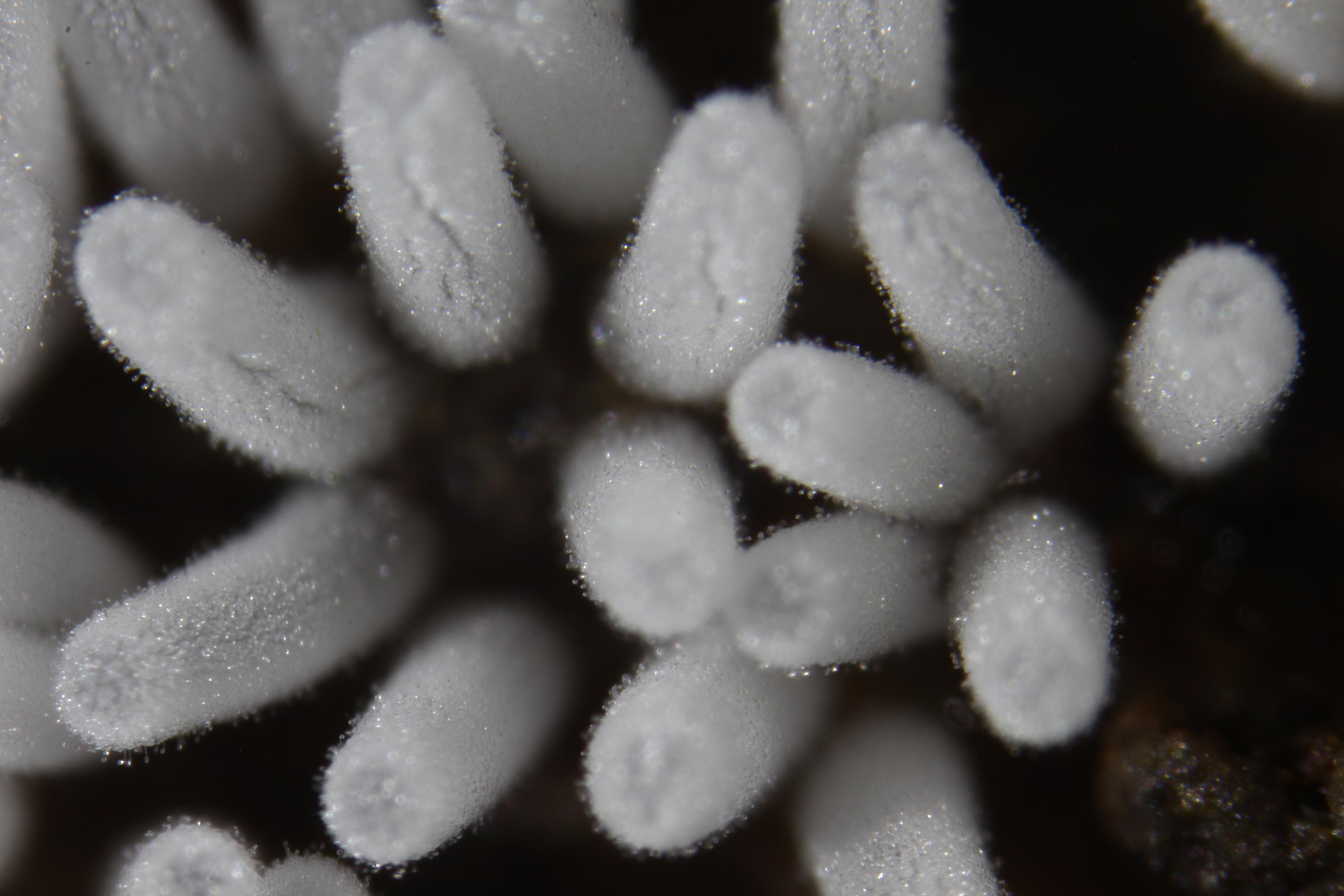 These columns of the common slime mold Ceratiomyxa fruticulosa bear external spores bound for propagation by insects and air currents. They occur exclusively on decaying logs. During the other parts of their life cycle they exist as single-celled microscopic amoebae and as a net of slime within the decaying wood. When the environment is suitably moist, they emerge and form these pillar structures, called fruiting bodies. The fruiting bodies are visible to the naked eye, between 2-3 millimeters tall, but here are magnified approximately 40 times larger. Species identification is traditionally determined by the shapes of these fruiting bodies, in this case appearing as dew-laden fingers; However, my work sequencing hundreds of genes reveals that morphology alone is not sufficient. Many cryptic species hide behind the form you see here.