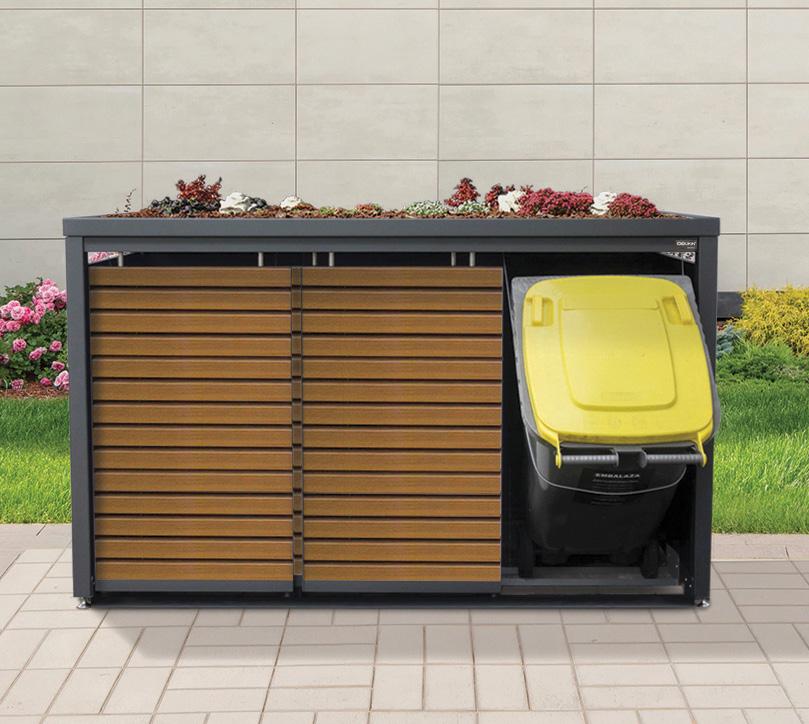 Predstavljamo inovativno rešitev za lepo in urejeno okolico hiše. Smetarnike StyleOUT® ali stilsko zasnovane omarice za zabojnike, s katerimi bo vaša okolica postala bolj urejena, posode za odpadke pa skrite, zaščitene pred vetrom, dežjem, snegom in ostalimi vre menskimi pojavi. Na voljo so različni modeli, velikosti in barve. Na vrata pa je mogoče montirati ključavnico. Z zasaditvijo strehe jih še polepšate in povežete z okolico. Postavitev smetarnika je enostavna, nastavljive noge pa omogočajo prilagoditev neravnim površinam.