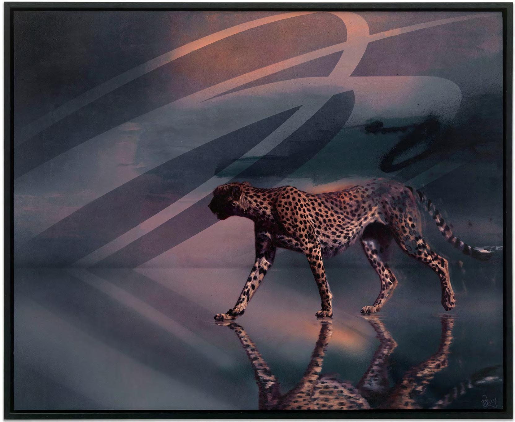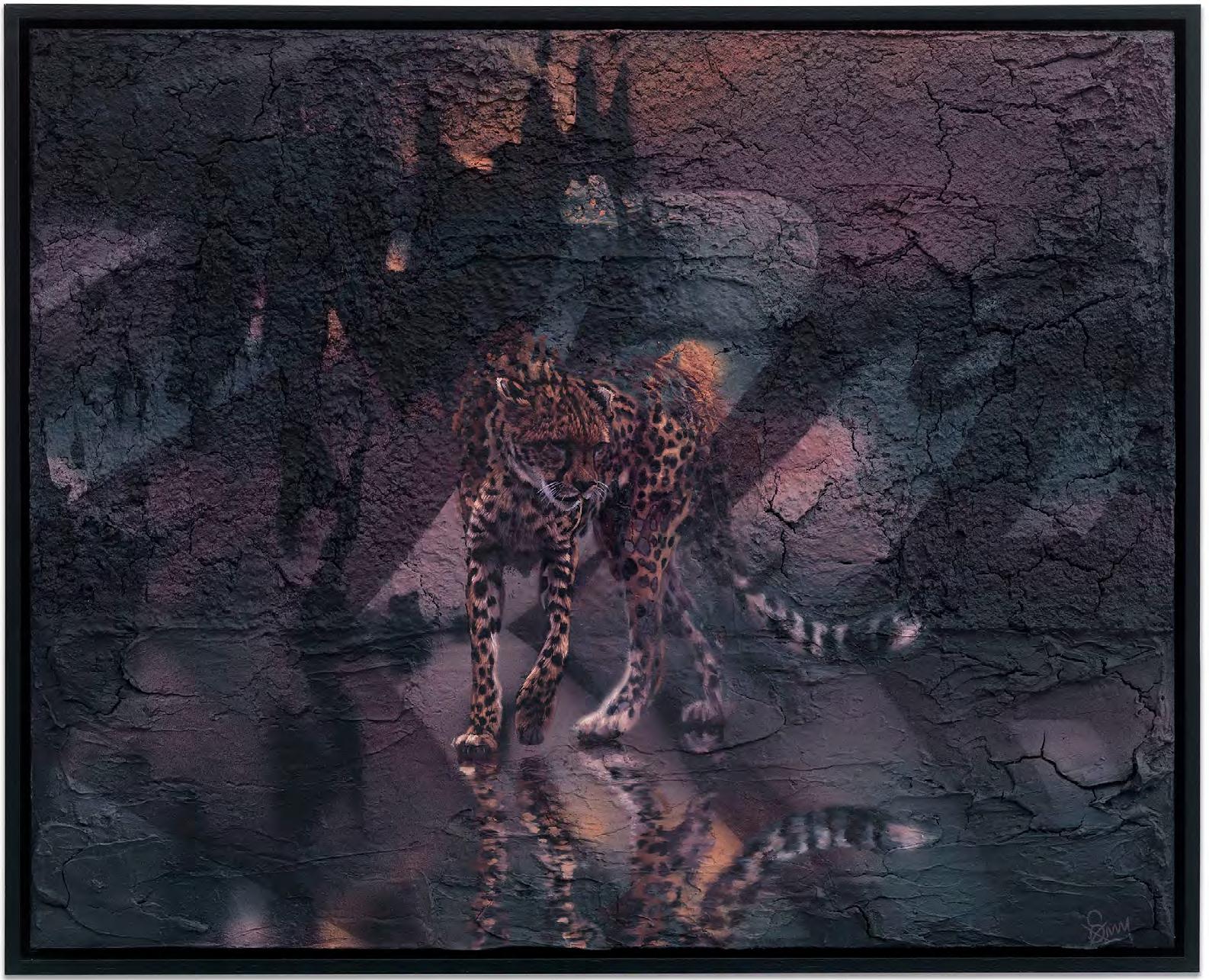£2,880 Smouldering Light is set against a fractured, textured backdrop where a cheetah emerges like a memory—an ephemeral figure drifting through a dreamlike terrain that bridges the urban and the wild. Embracing abstraction and expressive texture, the canvas mimics the gritty feel of concrete, layered with smoky greys and dynamic, nuanced hues. This bold interplay of shadow and light brings movement and depth, drawing the viewer into an atmospheric world where emotion and instinct converge. The rough surface offers a tactile experience, encouraging a deeper, sensory engagement. Through this work, Sonny explores the boundaries of wildlife representation, using abstraction to reveal the emotional undercurrents beneath the image, and inviting viewers into a space where raw nature meets urban expression.