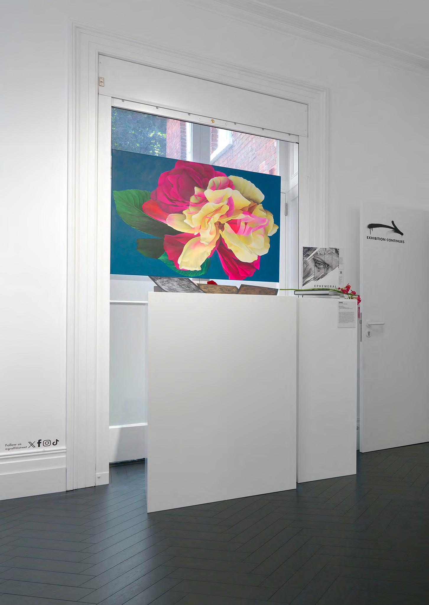 £3,800 Nebula Rose’ is a radiant homage to the union of creation and cosmic wonder. Inspired by the Rosette Nebula, where stars are born, and a mural Sophie painted in Oskarshamn, Sweden, it blends the celestial and the earthly. The Nebula’s likeness to a blooming rose, with its soft pinks and ethereal glow, weaves space and flora into a harmonious dance. The artist’s garden roses anchor this celestial scene, infusing the vastness of the universe with personal, grounded beauty. This work is a meditative reflection on transformation, the way disparate forces collide, merging to create something utterly new. With its rich colours and layered textures, Nebula Rose invites us to witness creation as a beautiful collision of worlds, both boundless and intimate.