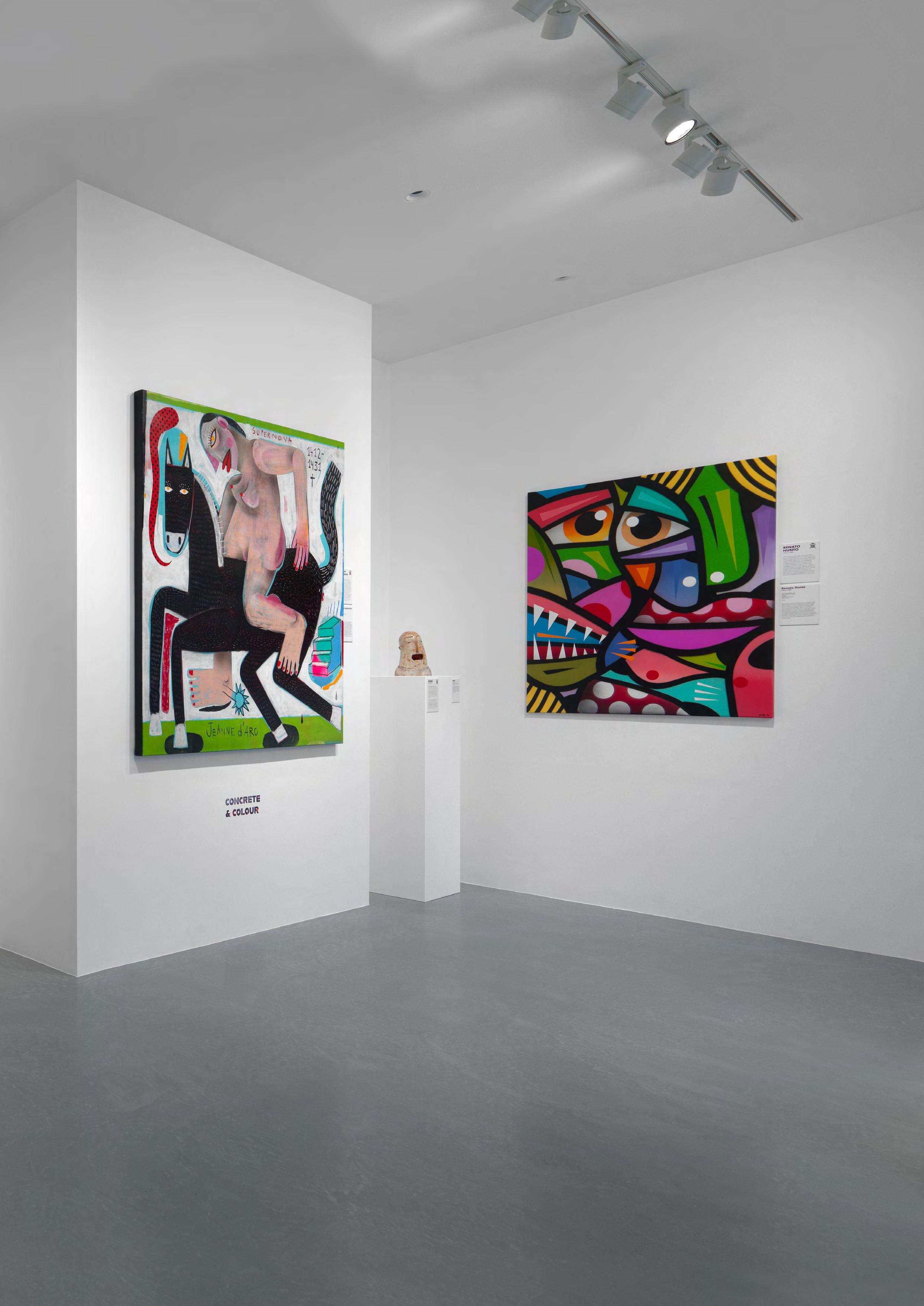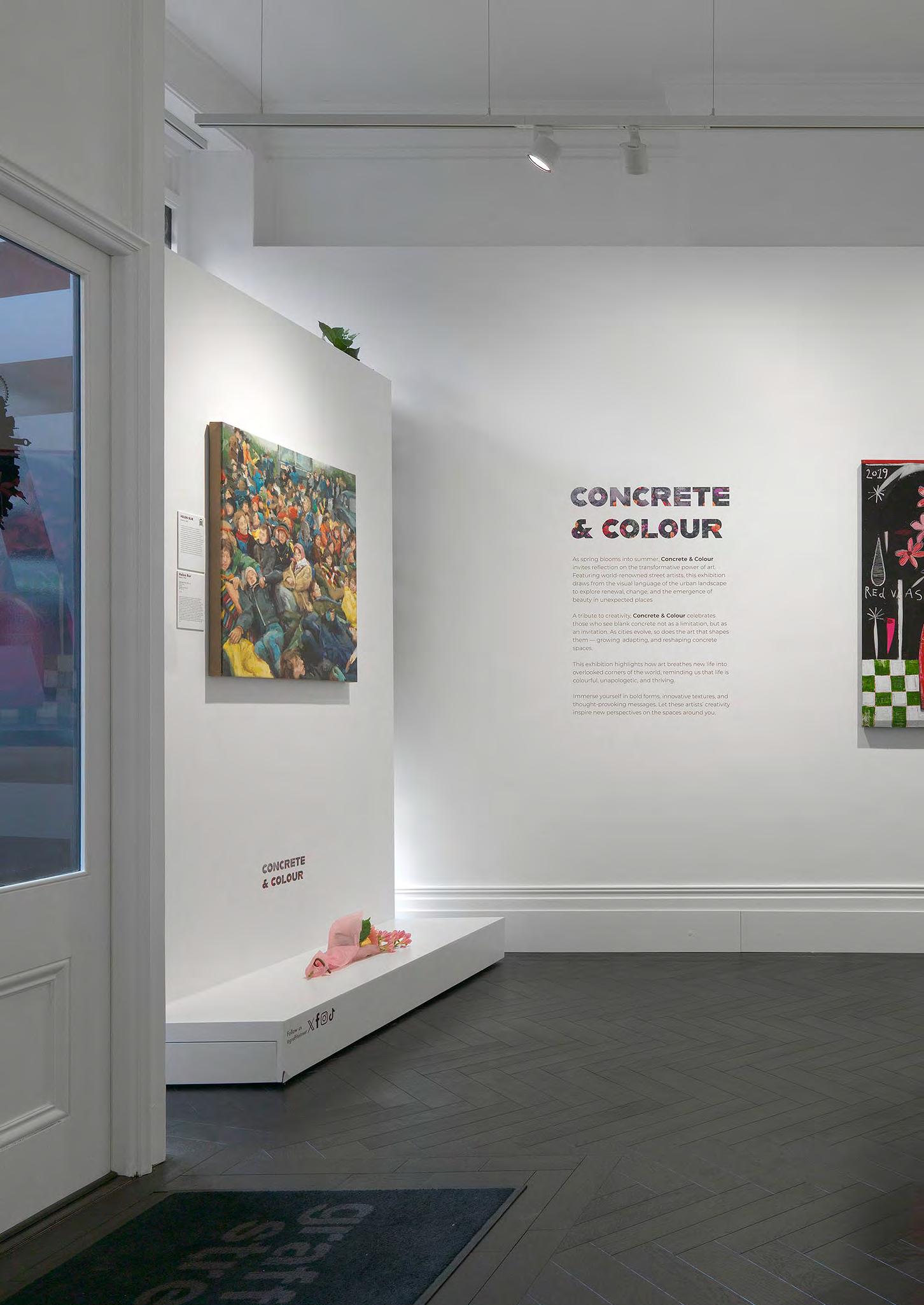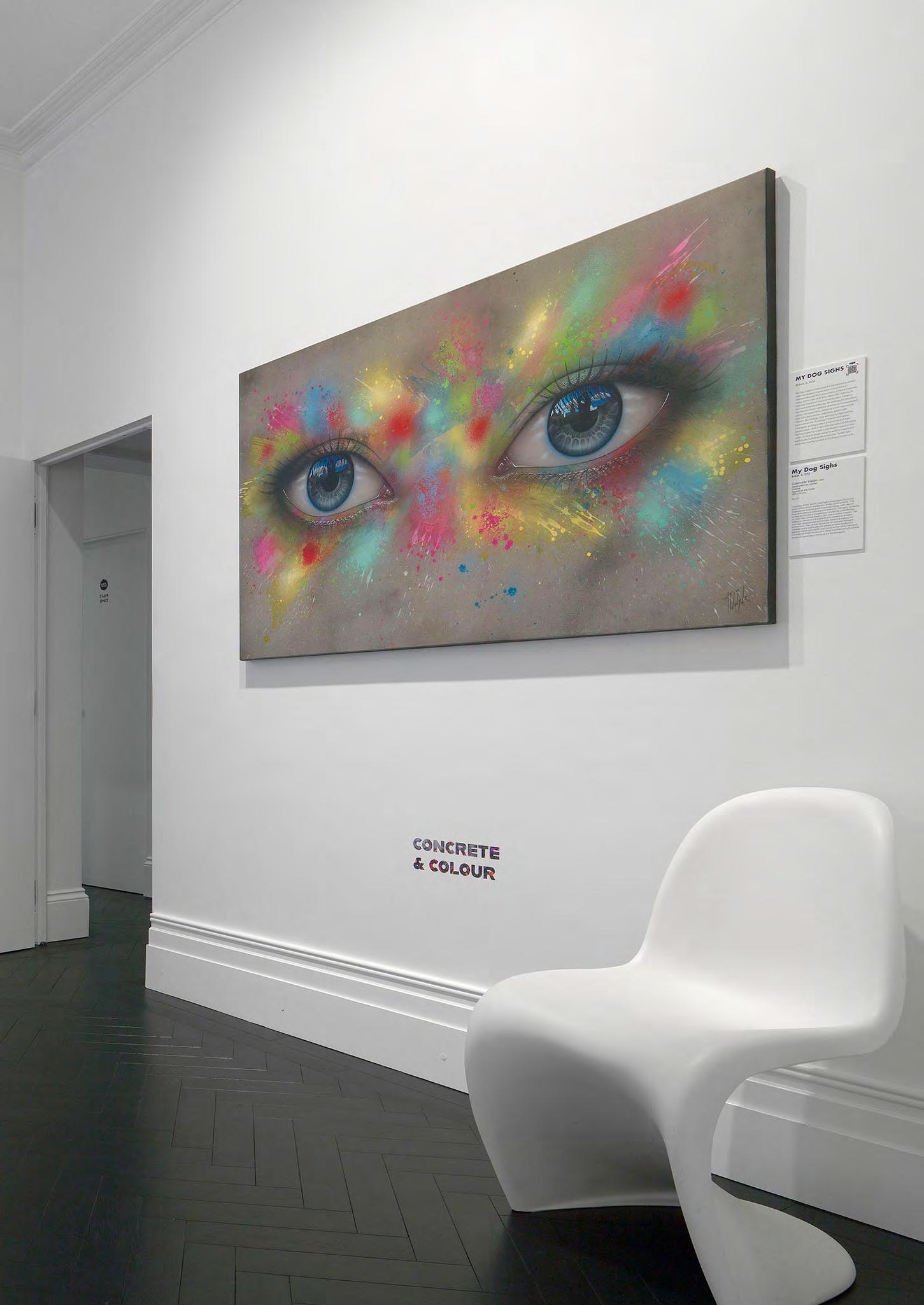 £6,750 Concrete Vision’ by My Dog Sighs showcases his iconic eyes, within which a reflection of the world unfolds. The large canvas is enveloped in smokey tones, with vibrant hues that balance softness and intensity. The eyes, symbolic of perception and introspection, reveal the complexities of urban life—where beauty, grit, and emotion coexist. The reflective nature of the piece invites viewers to project their own experiences and stories, fostering a personal connection. This canvas becomes an intimate dialogue between artist and audience, where smokey tones and swirling colour add depth and mood to the urban narrative. Concrete & Vision is not just a visual experience but a space where art becomes a mirror of our shared world.