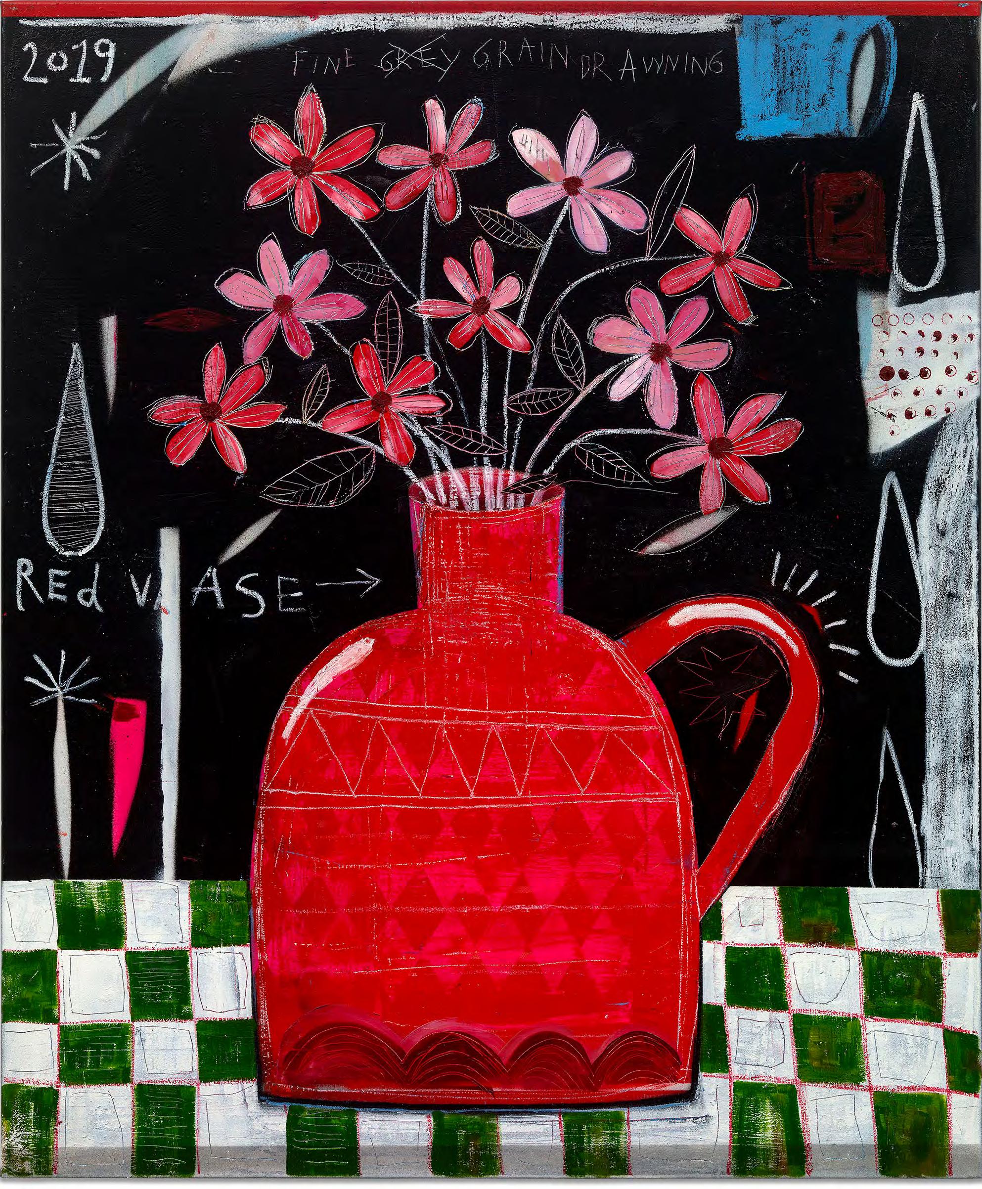 ‘Red Vase and Flowers’ represents a significant milestone in Joachim’s artistic journey, being his first work without human or animal forms, marking his entry into the still life genre. In this piece, Joachim delves into the expressive power of complementary colours, particularly red and green, which enhance each other’s vibrancy. The composition was carefully refined, achieving a perfect visual balance. Beyond traditional brushwork, Joachim employs innovative techniques like scraping with knives and scratching fine lines onto the canvas, creating intricate textures visible in the petals and foliage. This piece not only reflects technical growth but also a new sense of quiet confidence, where simplicity and depth coexist in living colour.Red Vase and Flowers marks Joachim’s debut in still life, boldly exploring red and green contrasts. The artist brings delicate life to flora using unique techniques like scraping and scratching, revealing a striking, detailed beauty in the composition.