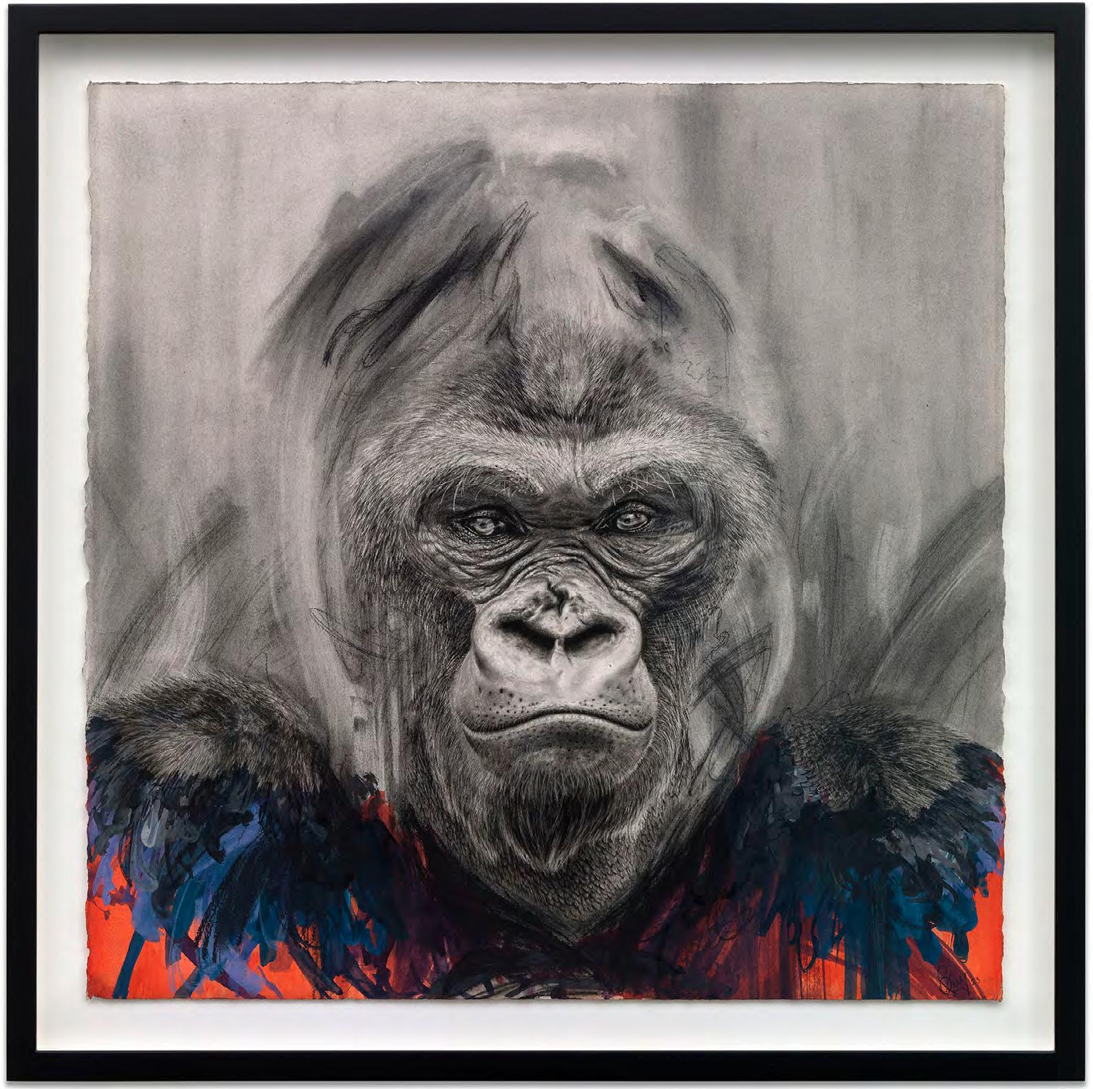 Ishema’ meaning “pride” in Kinyarwanda is a powerful portrait that embodies strength, dignity, and ancestral presence. In this large-scale work, Sonny fuses the precision of charcoal realism with his signature graffiti-inspired aesthetic. The gorilla’s penetrating gaze commands attention, while vibrant, expressive strokes of colour ripple across its shoulders, echoing the energy of street art. This visual tension between control and spontaneity mirrors the artist’s exploration of nature’s place within an increasingly urbanised world. Rich in symbolism and emotion, Ishema challenges traditional wildlife portraiture by bridging cultural and visual languages. Through this fusion, Sonny not only honours the spirit of the gorilla, but also elevates it as a timeless symbol of resilience, identity, and the wild’s enduring voice.revealing a striking, detailed beauty in the composition.