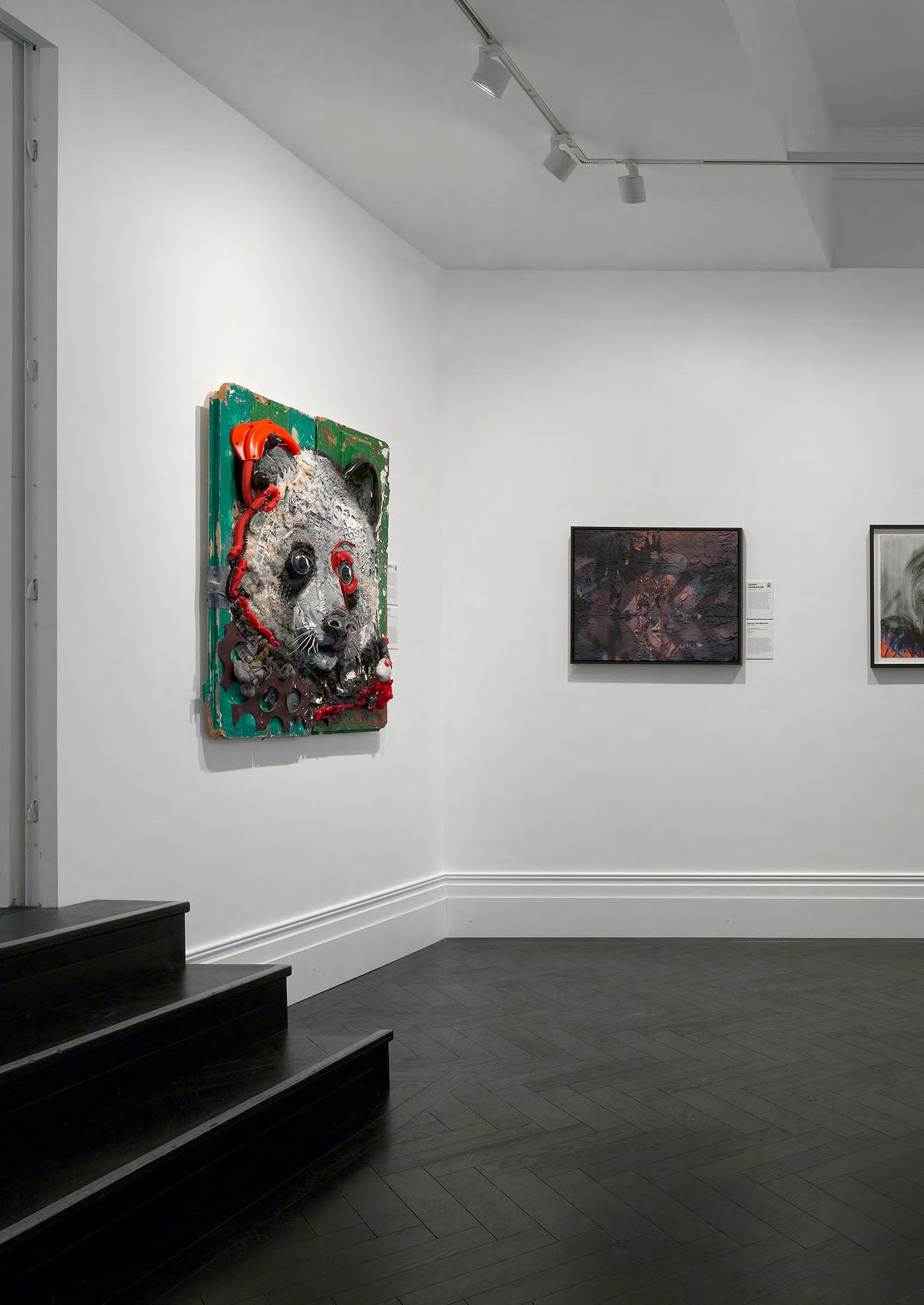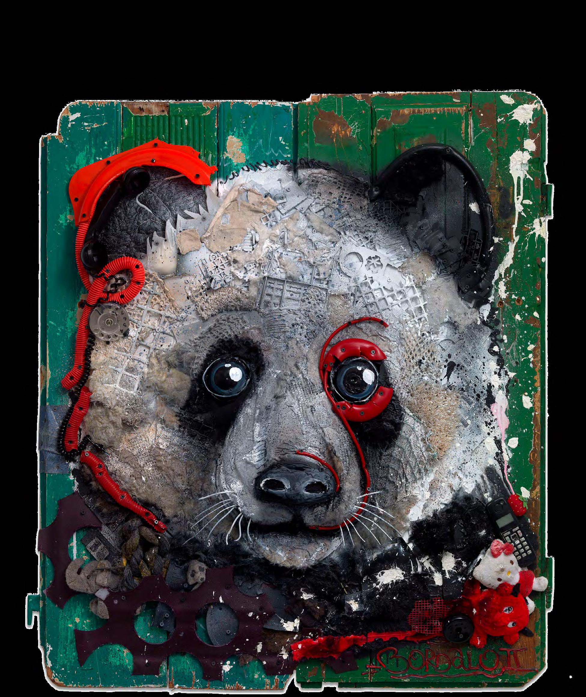 Bordalo II’s ‘Neutral FX Panda’ is a striking piece from his iconic Trash Animals series, created entirely from discarded materials such as plastic toys, broken objects, and industrial waste. This powerful sculpture addresses the environmental crisis of overproduction, plastic pollution, and its devastating effects on ecosystems and wildlife. The red rotary phone, encircling the panda’s face and wraps around the right ear, serves as a symbolic “wake-up call,” urging urgent action to combat these global challenges. Through the transformation of trash into art, Bordalo II forces us to confront the consequences of our consumption and reconsider our values. The Panda stands as a poignant reminder of the importance of sustainability and the need to protect endangered species, while highlighting the pressing environmental issues of our time.