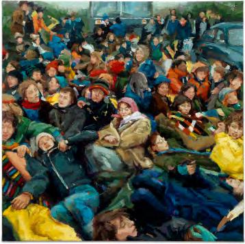 Helen Bur’s ‘Women for Life’ revisits the 1981 Greenham Common Women’s Peace Camp, a pivotal moment in feminist and anti-nuclear activism. Inspired by Mike Goldwater’s iconic photo, the painting draws from archival imagery to depict the women who marched 100 miles from Cardiff to the US airbase, carrying banners reading “Women for Life on Earth.” Their peaceful protest aimed to halt nuclear escalation and promote East-West cooperation. Dressed in bright scarves and jackets, the women sit in defiance, halting a bus en route to the military base. Helen Bur’s focus remains on the women - grounded, determined, and unshaken - set against a muted military backdrop, transforming concrete into a site of resistance. Their message endures each May 24th, Women’s International Day for Disarmament and Peace: we remember, we resist, we rise.