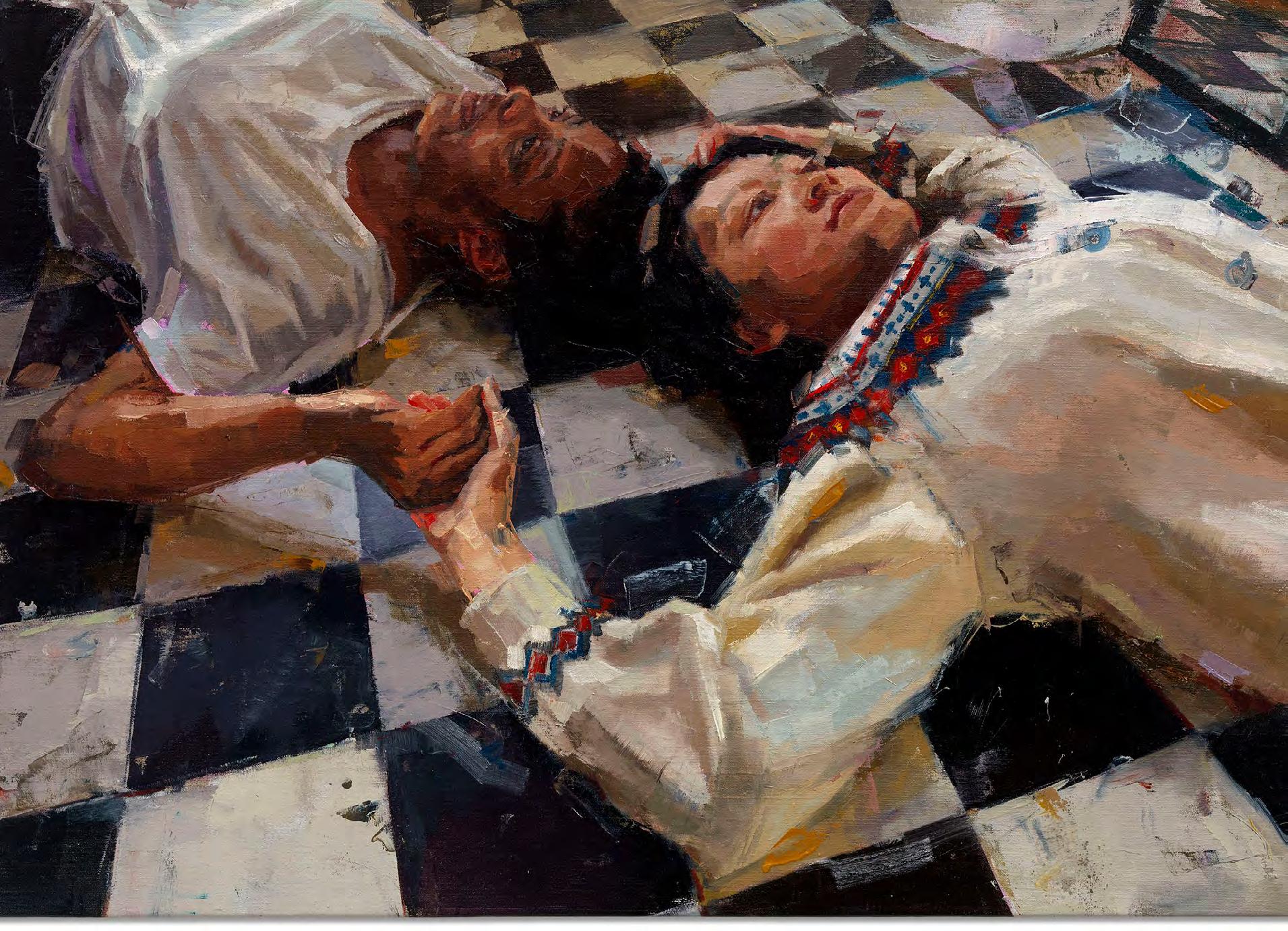 In ‘Pillars’, Helen Bur presents a poignant study of solidarity through stillness. Painted in oil on linen, the work features two women lying on their backs, head-to-head, their hands clasped in quiet connection. The mirrored posture suggests both vulnerability and resilience, as if each figure draws strength from the presence of the other. The composition evokes themes of mutual support, communal endurance, and feminine resistance without spectacle, rooted in a calm, deliberate intimacy. The title, Pillars, signals the foundational role of collective strength, particularly in contexts of protest, grief, or care. With strong, meditative tones and restrained gesture, Bur invites us to witness solidarity not as grand action, but as quiet, essential presence, an act of resistance held in stillness.