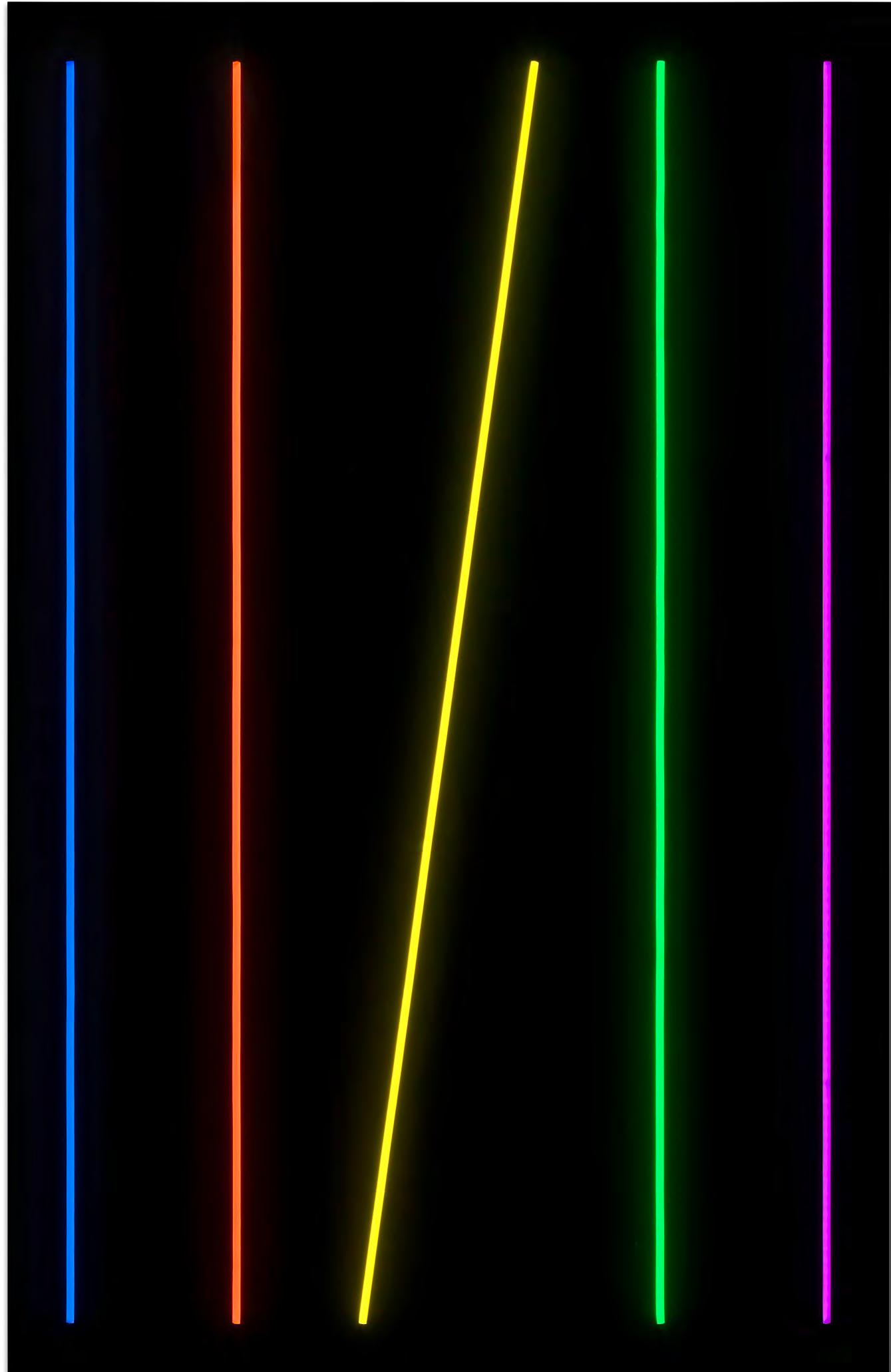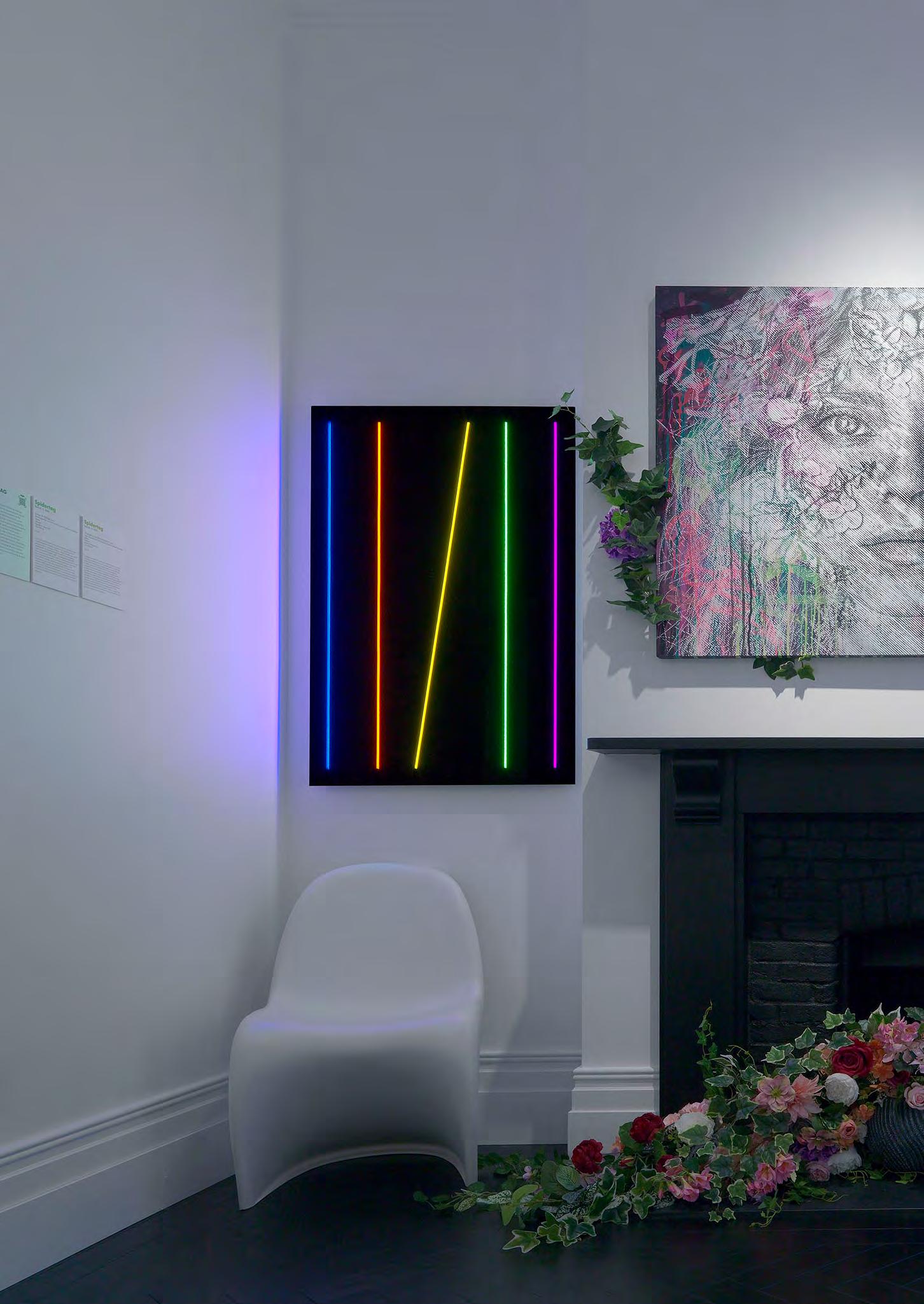 Lines channels Spidertag’s mural energy into a kinetic neon composition that moves through space via a five-colour sequence: Blue _ Orange _ Yellow _ Green _ Purple. Each shift is deliberate, an intentional rhythm, with the line moving freely, like graffiti made of light. The sequence plays with both contrast and harmony: bold complementary shifts from blue to orange, followed by smoother analogous transitions from yellow to green, and then green to purple, not a conclusion, but a shift into a new phase. The lines remain parallel, holding tension, except for the yellow line, which breaks rank , this moment of deviation is rebellious, a symbol of evolution. The piece flows through space in a chromatic rhythm that mirrors the vibrancy of a city, dynamic, colour ful and alive.