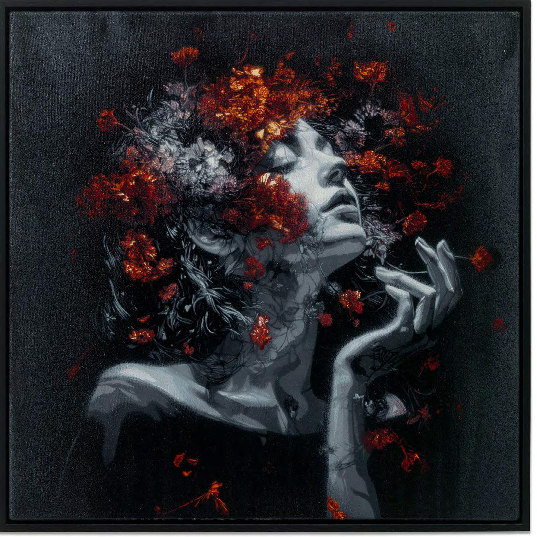 From the walls of New York City, ‘Morning Lights’ captures its quiet breath rising against the city’s restless rhythm. A portrait of a woman, eyes closed, feels the hush of morning before it moves. Around her, deep orange flowers bloom, rising like the glow of waking skies, not as decoration but as something elemental, encasing her in life, letting nature slowly claim the space. Rendered in a rare orange palette, this piece continues the artists’ evolving exploration of growth, a floral presence that, over time and across continents, has begun to overtake the figures they portray. Like the first light of dawn, quietly spreading, never rushing, always present, Morning Lights carries the rhythm of change. A quiet crescendo. This is not a portrait of waking, but of feeling light as it arrives.